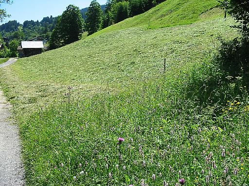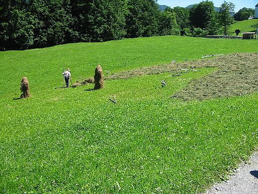 nach demTrocknen wird das Heu auf der Wiese ausgelegt und nachgetrocknet