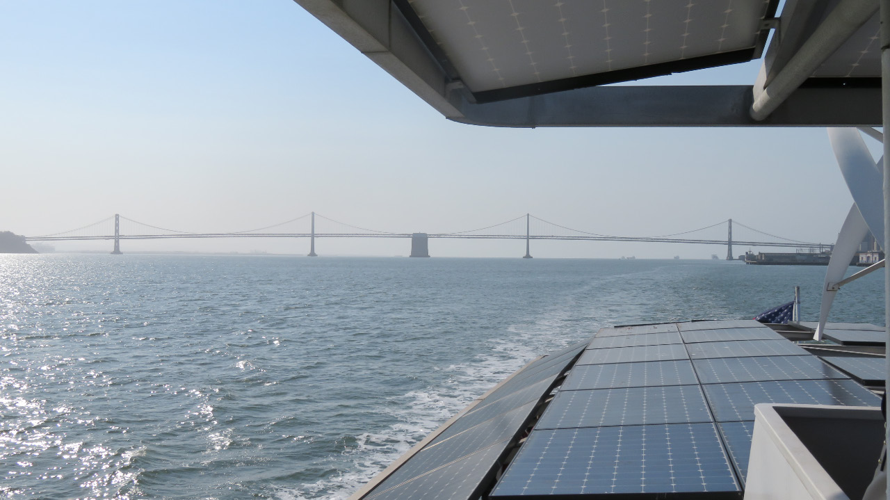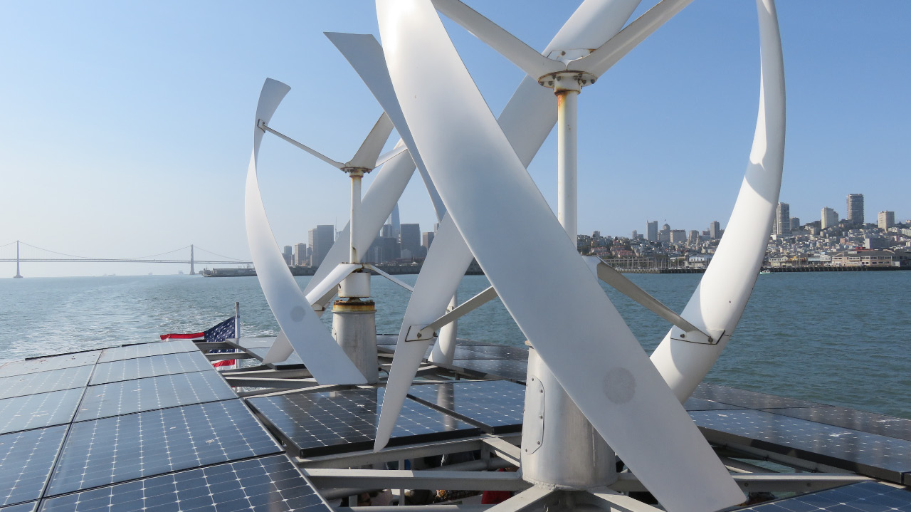 Energiegewinnung durch Windkraft (Flettner-Rotoren) und Solarpanele auf der Fähre