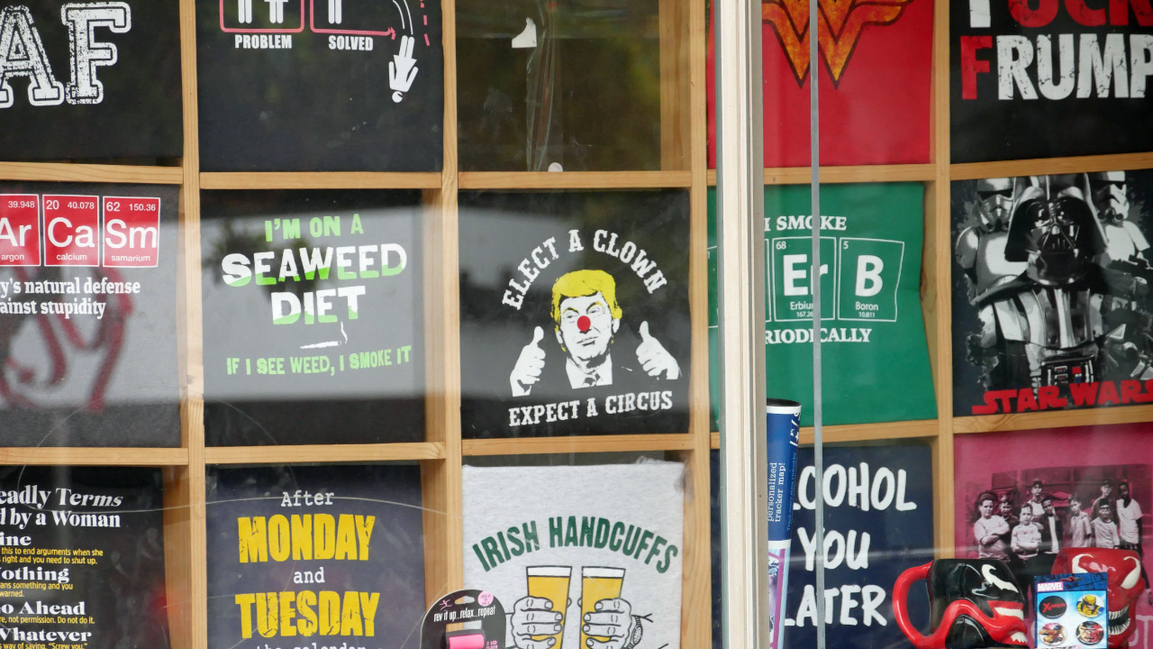 Allerlei - auch politische - Sprüche auf den T-Shirts, die zum Verkauf angeboten werden