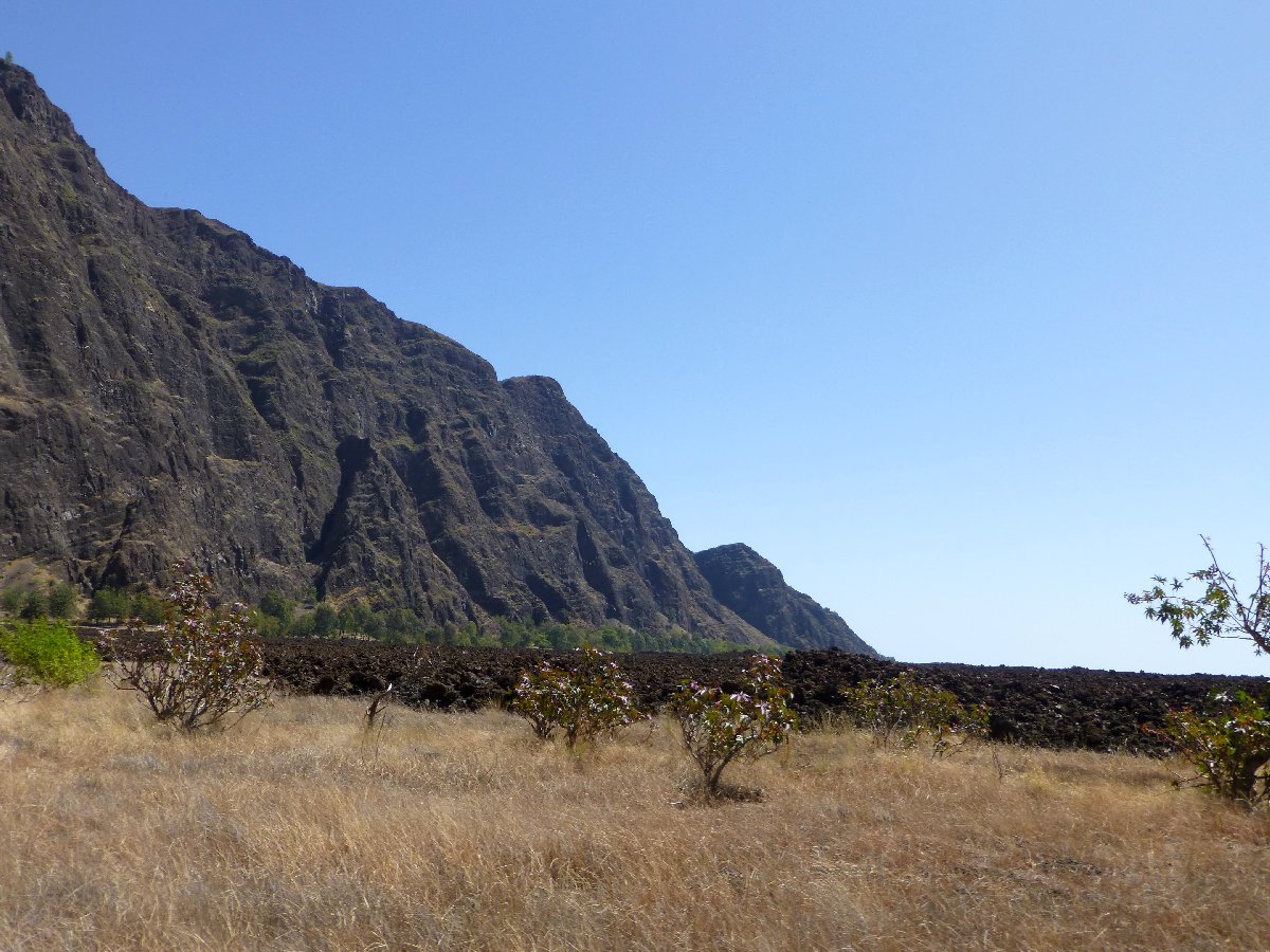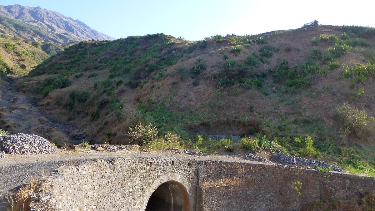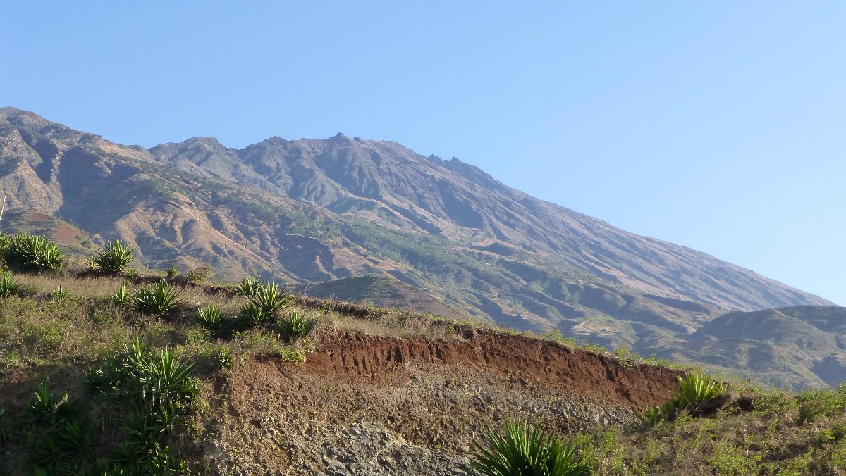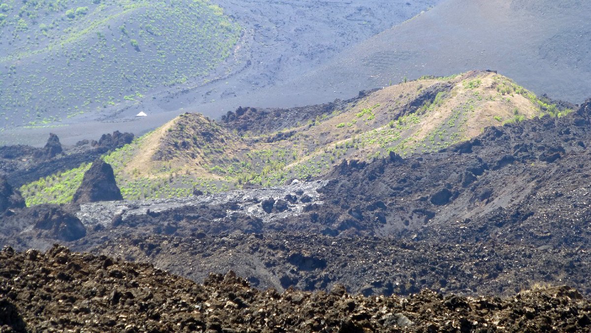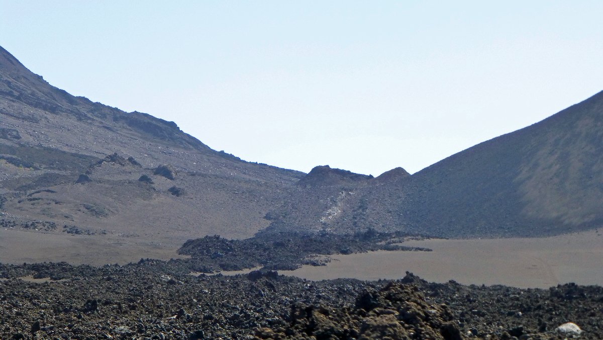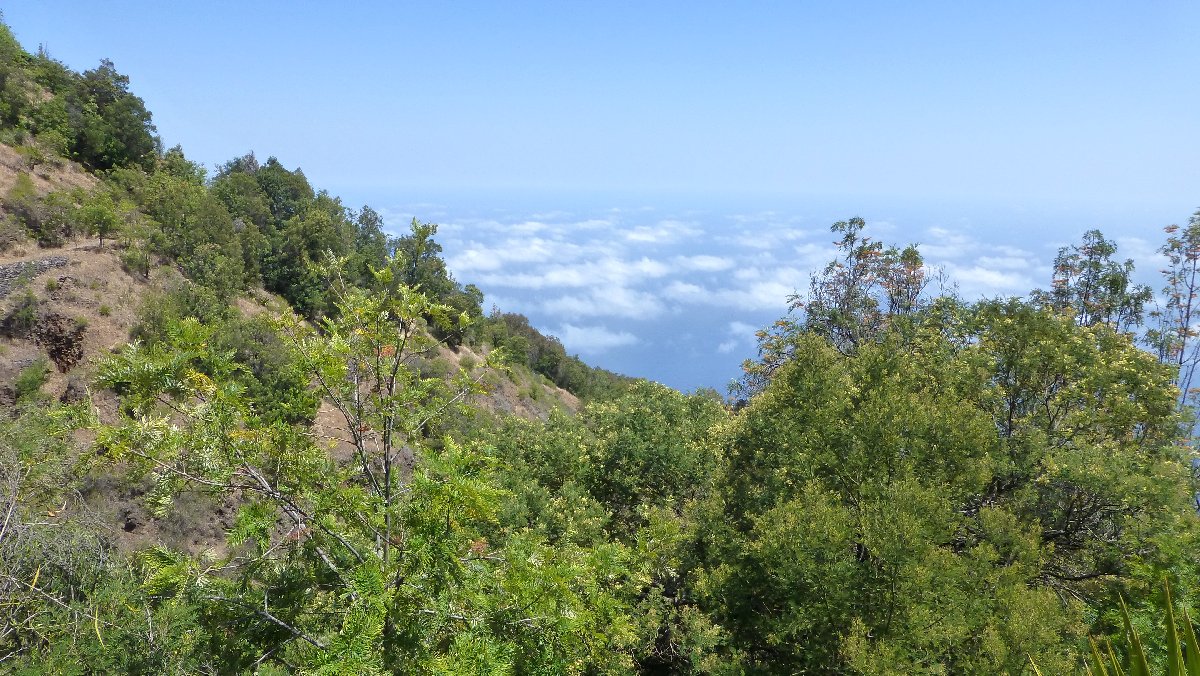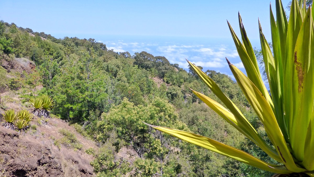 direkt unterhalb der Caldera wird es auf der Nordseite grüner, hier steigen Passatwind auf und Wolken bilden sich