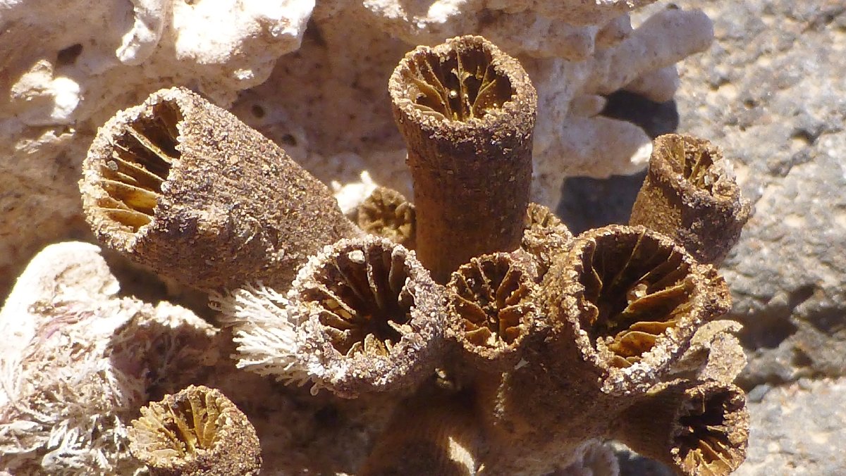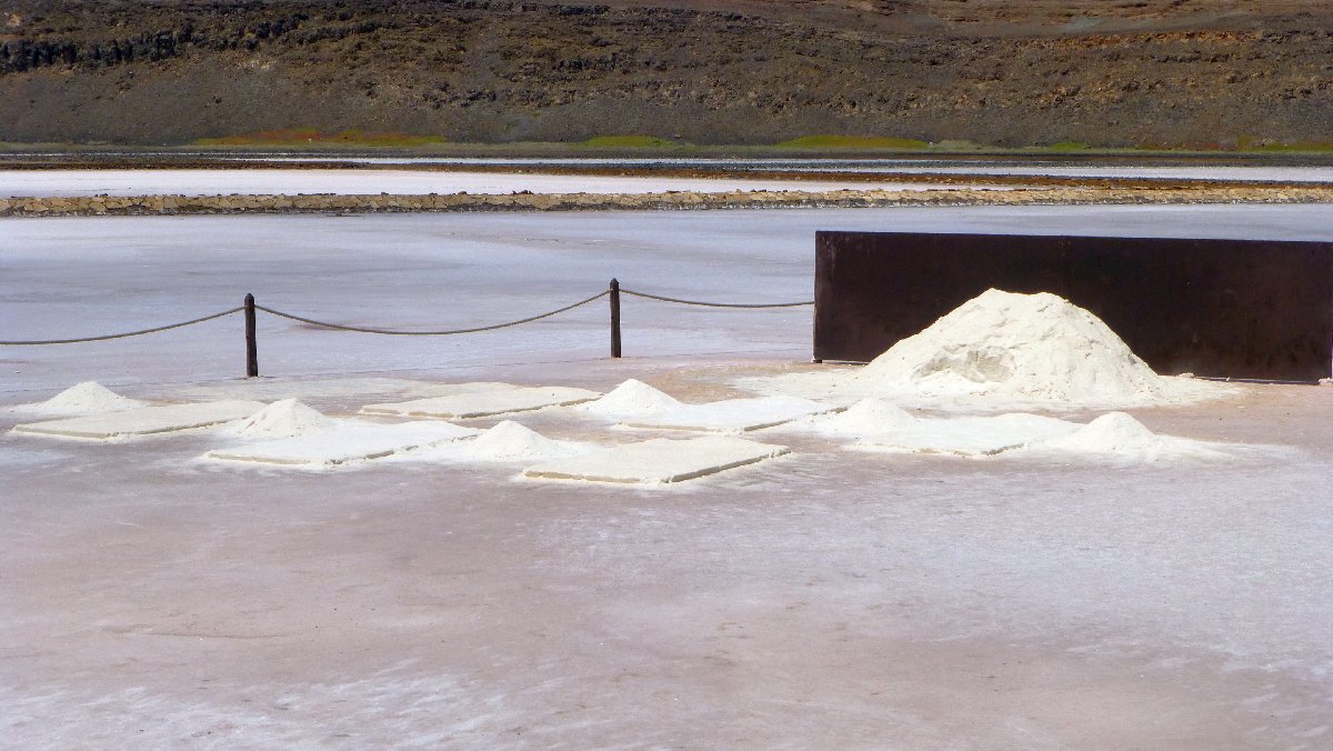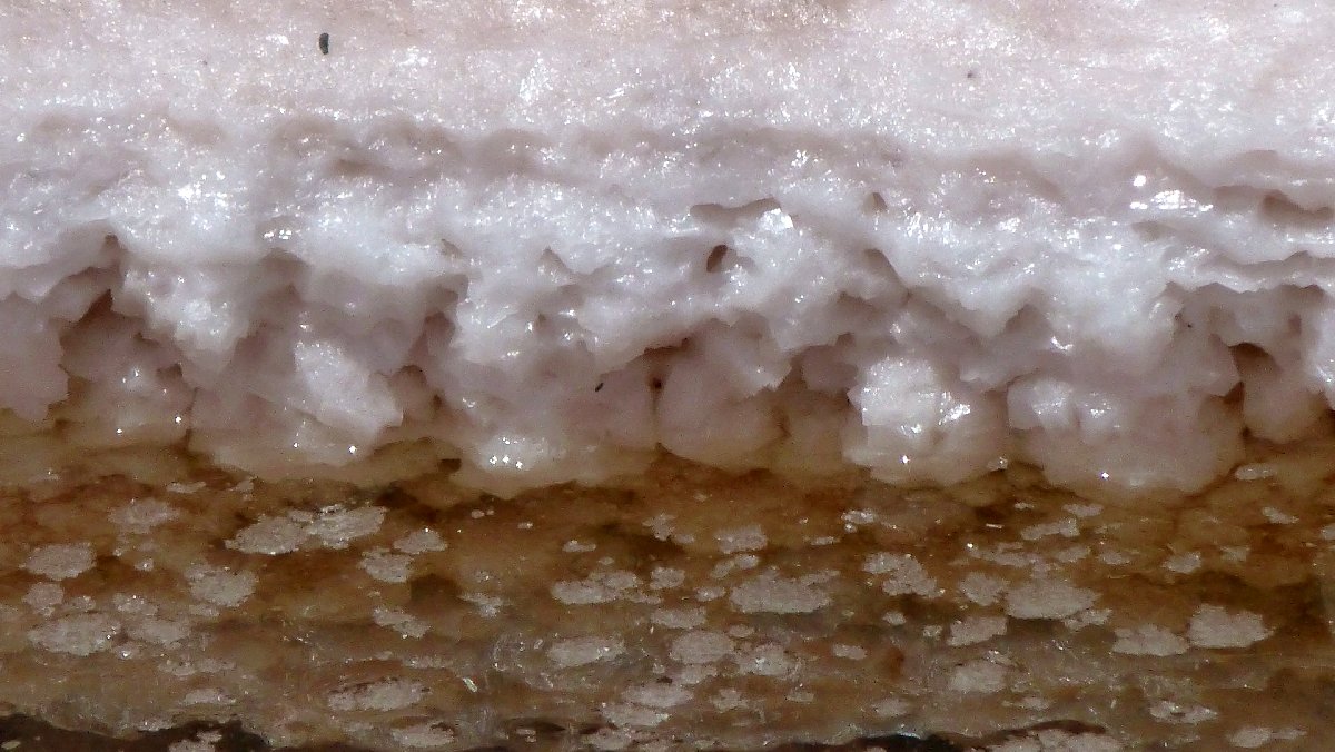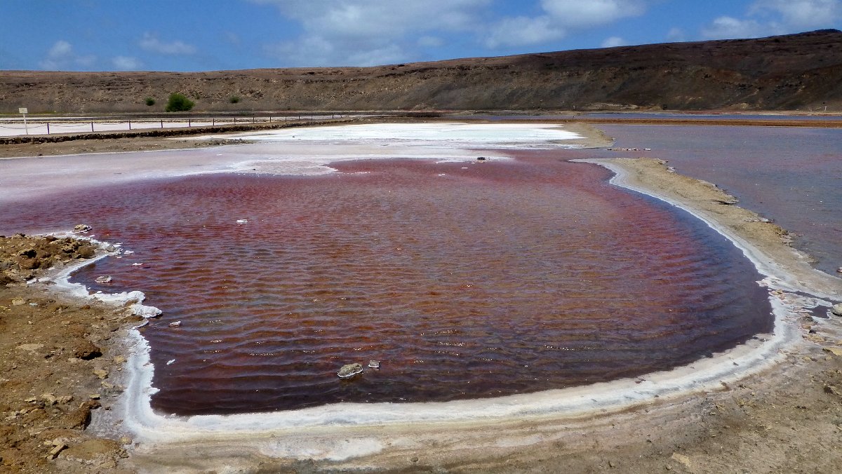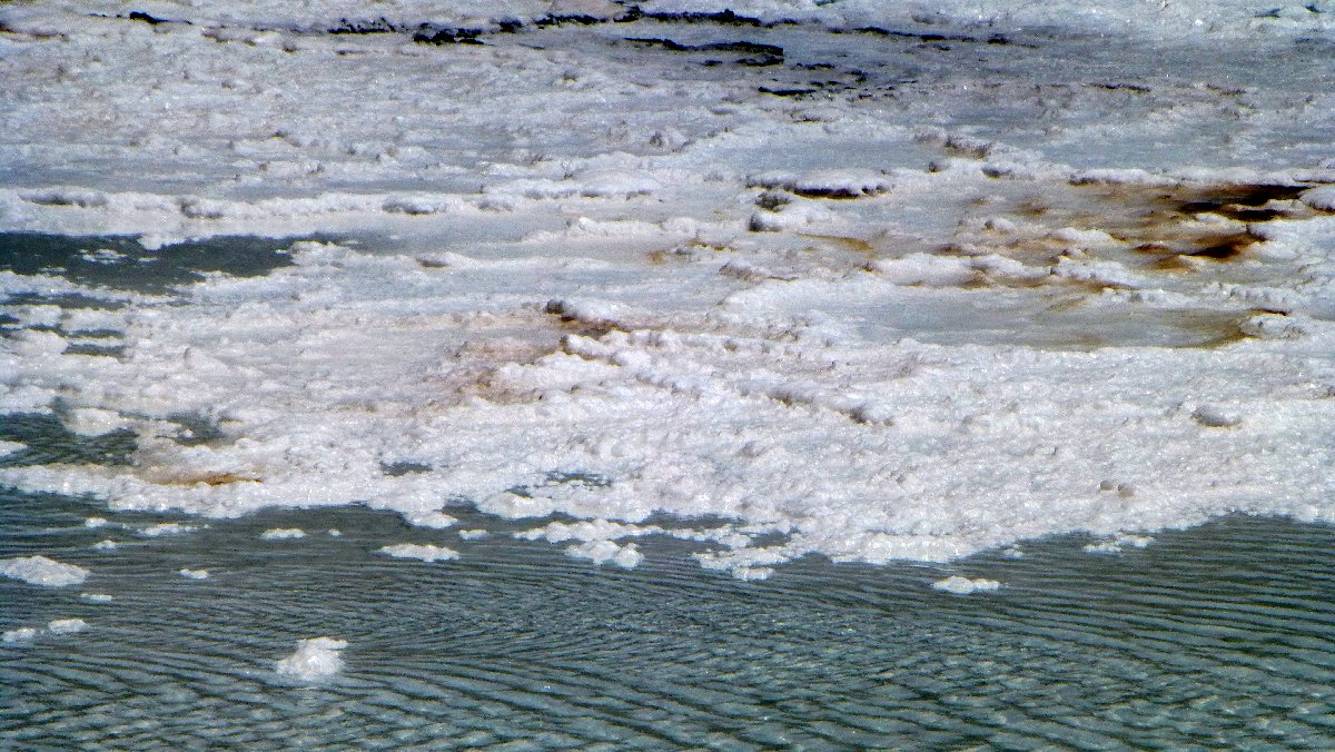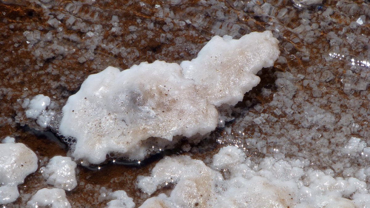 übersättigte Salzlösung in den Becken: Salzkristalle entstehen am Grund und an der Oberfläche