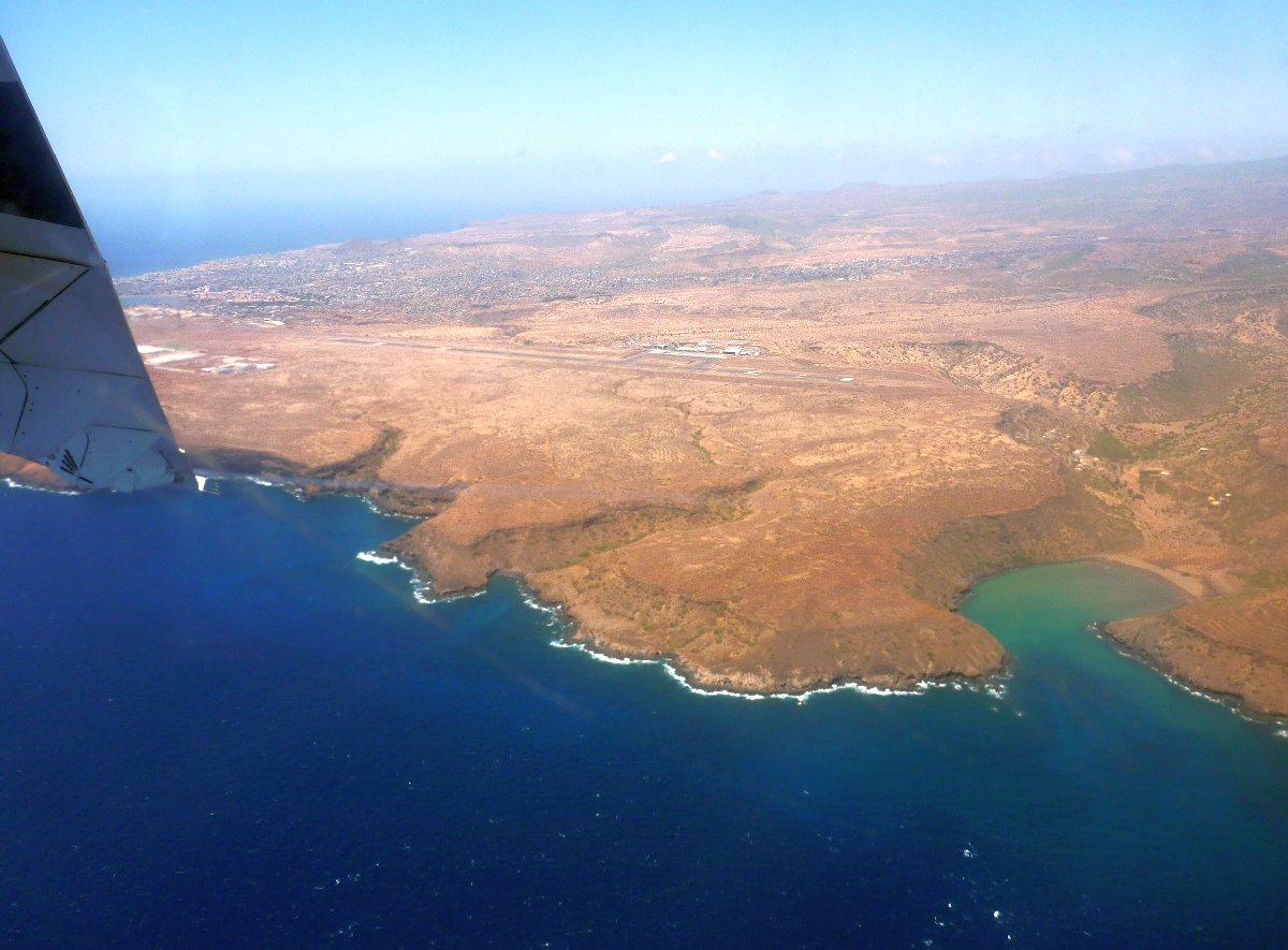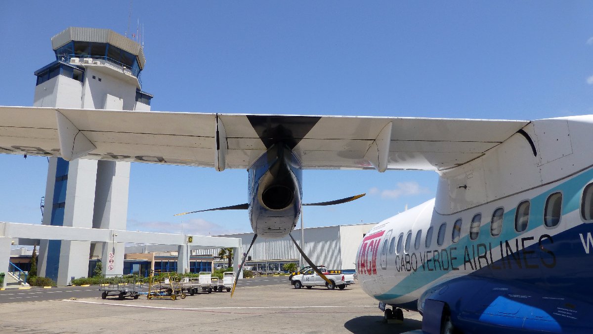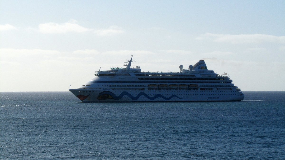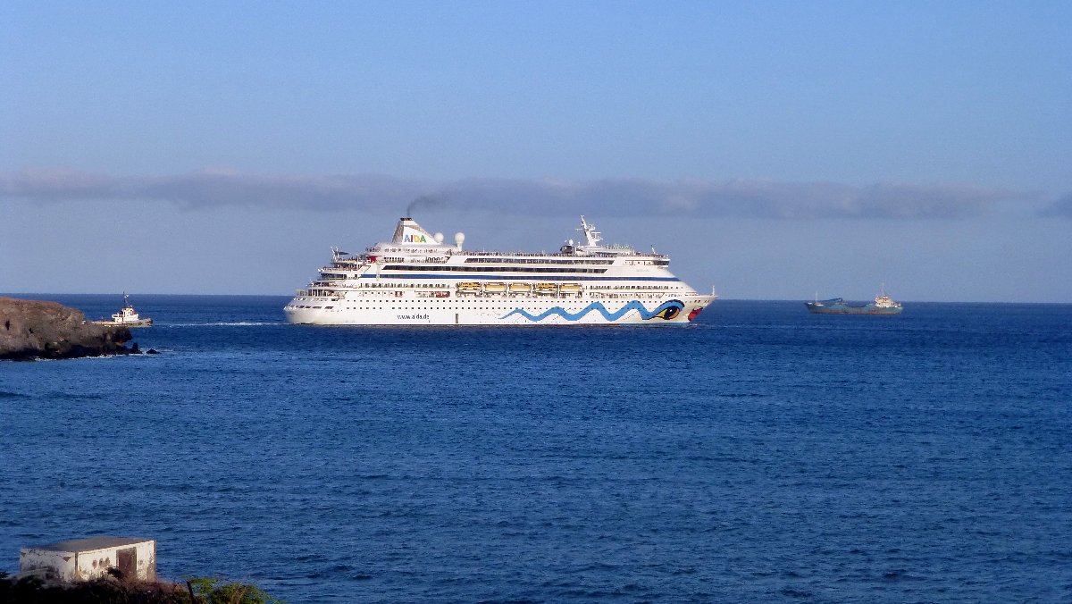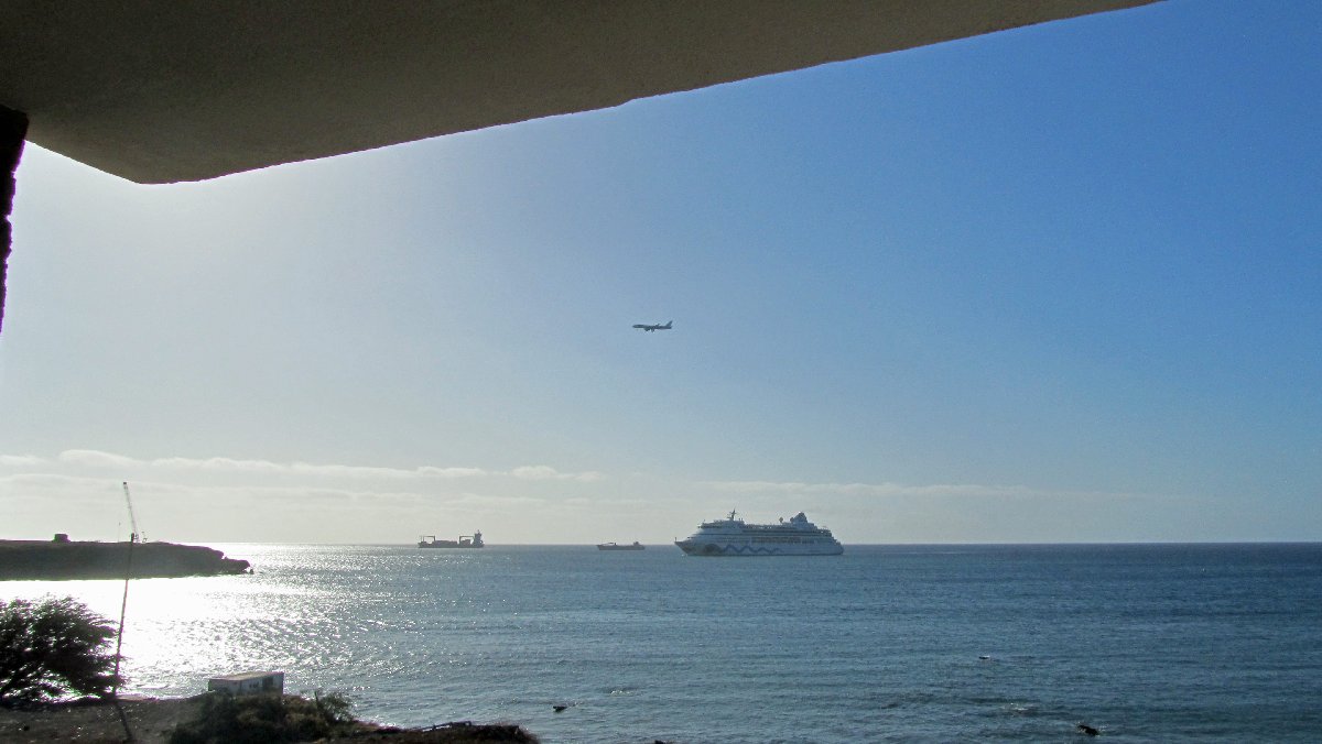Blick aus dem Hotel: Flugzeug beim Landeanflug und ein einlaufendes Kreuzfahrtschiff
