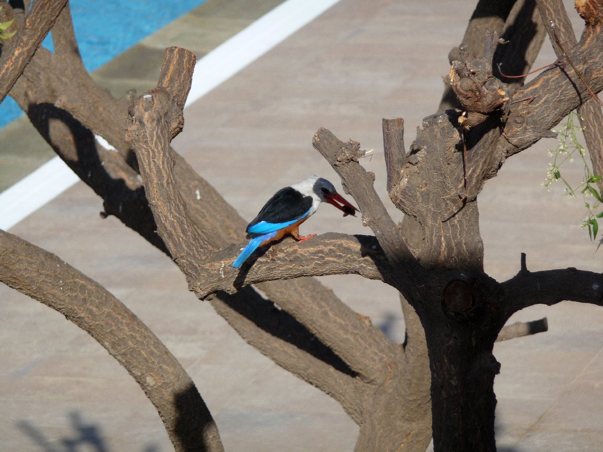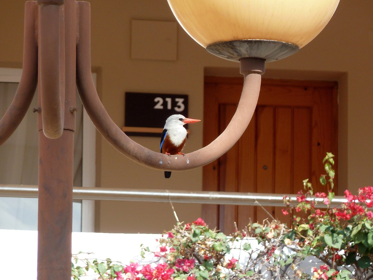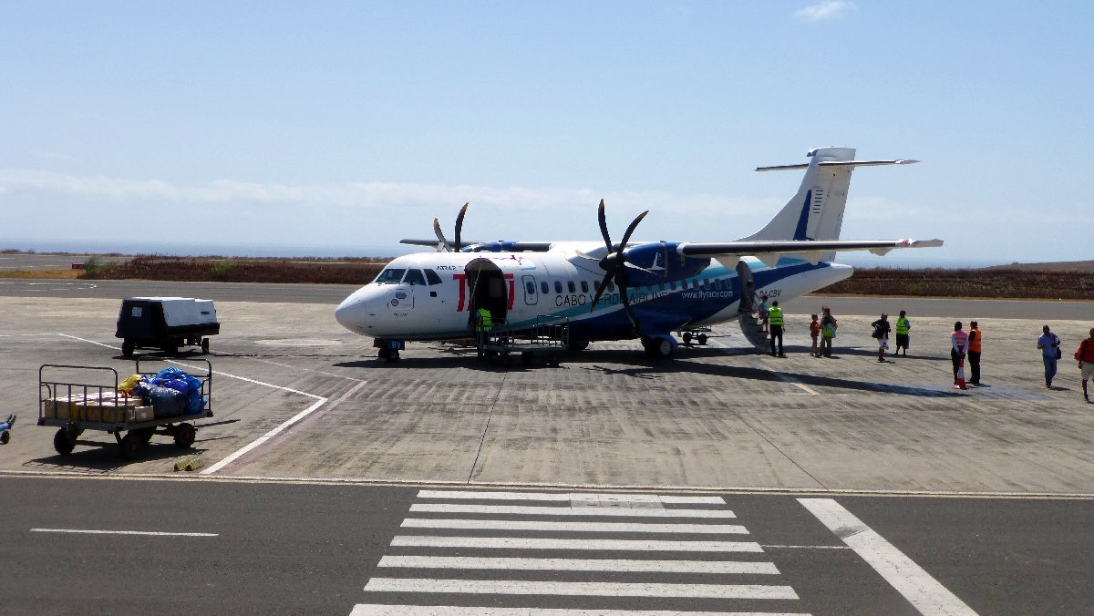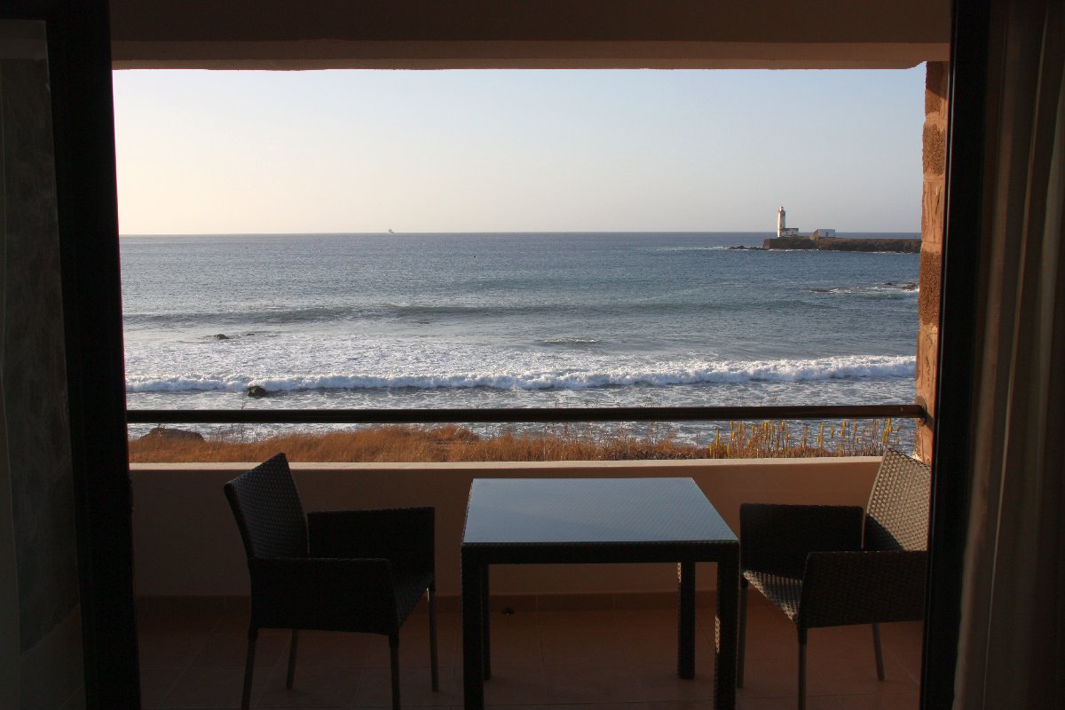 Blick aus dem Hotel: Flugzeug beim Landeanflug und ein einlaufendes Kreuzfahrtschiff