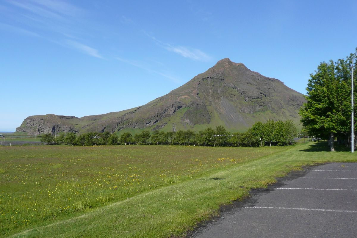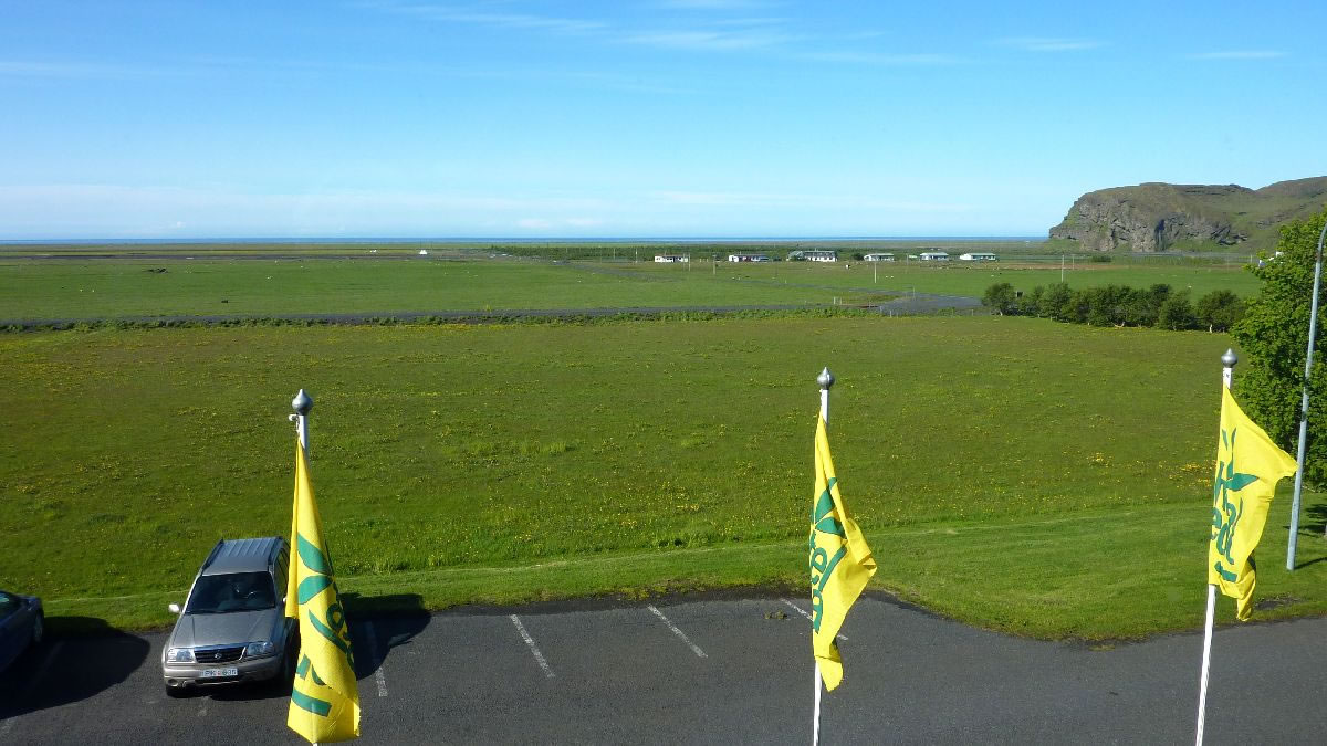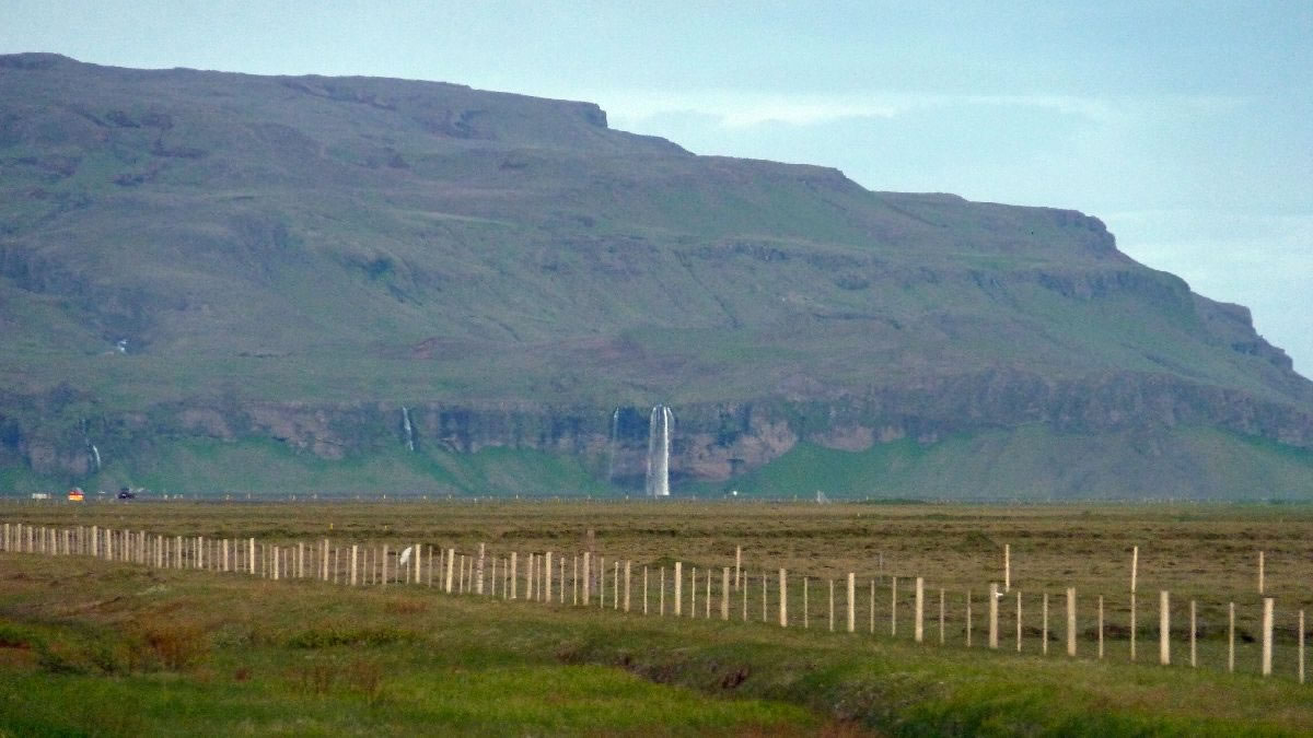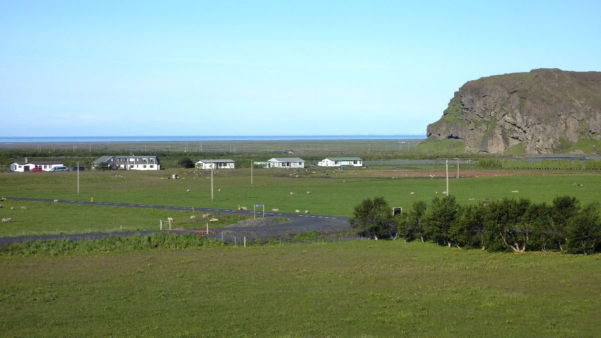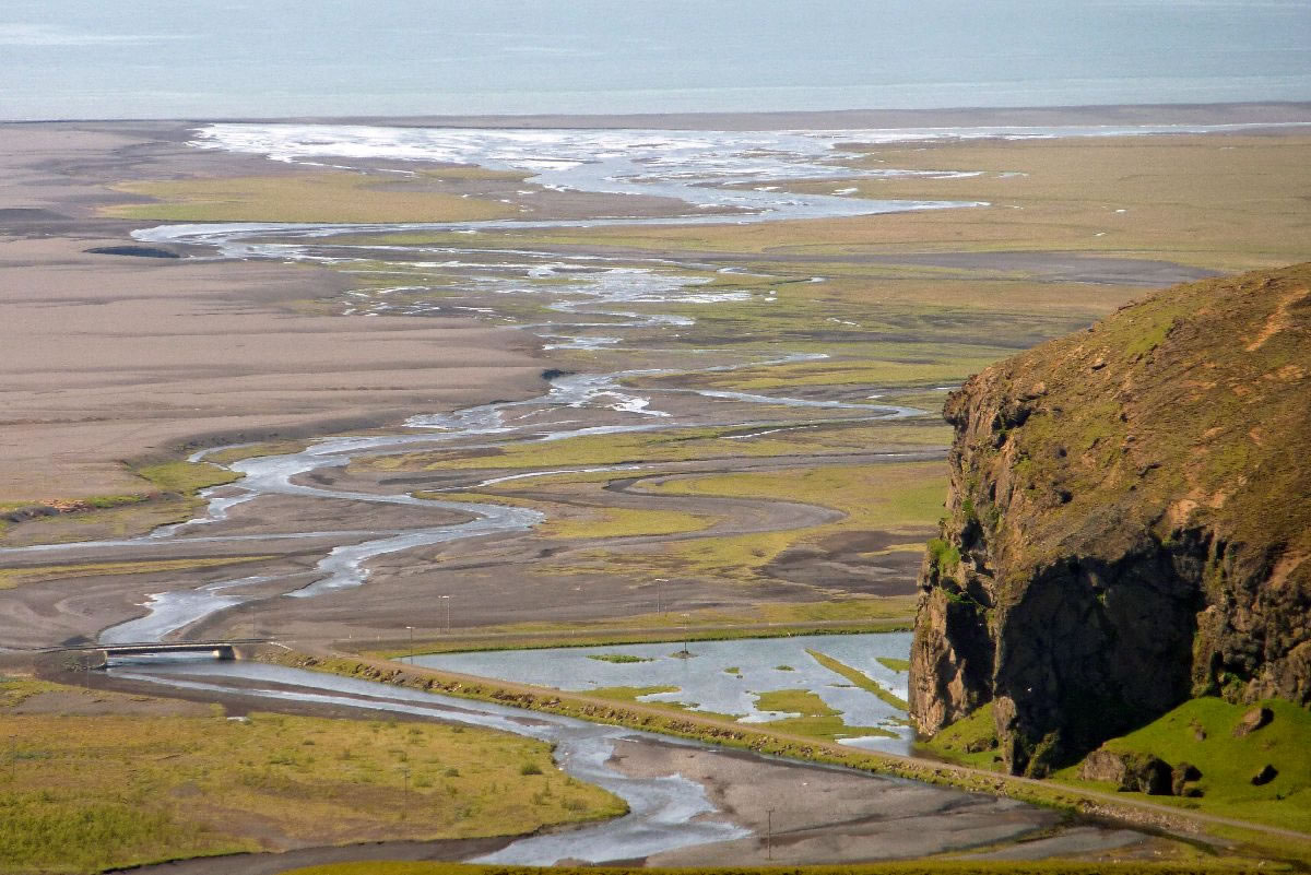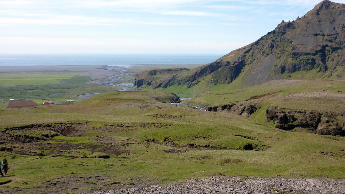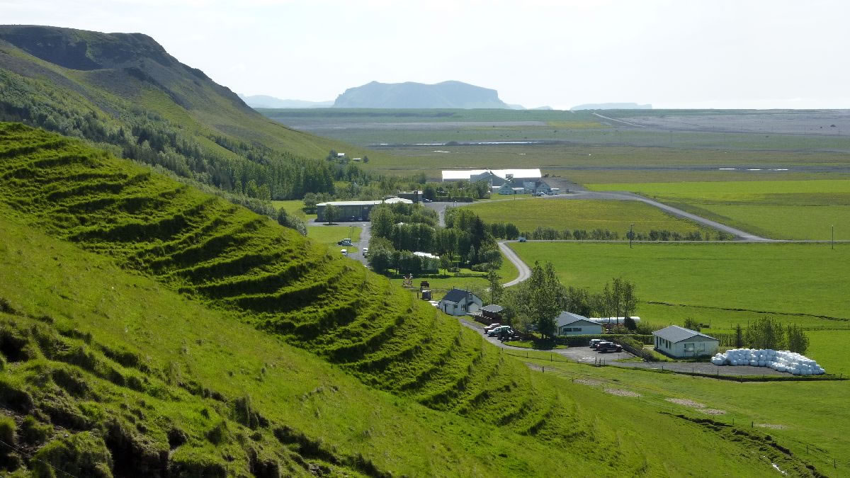 Blick über Skogar: rechts Schwemmlandflächen (Sandur), links am Hang durch Vieh entstandene "Terrassen" (Viehgangeln)
