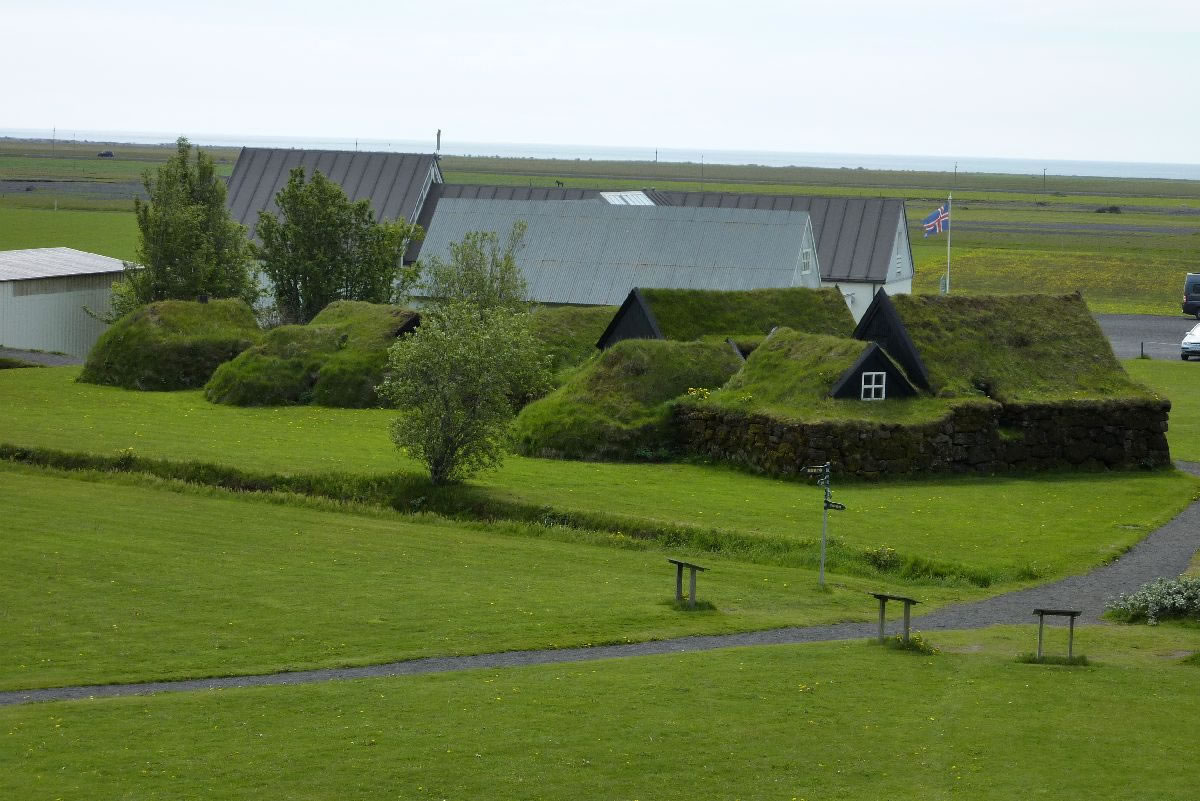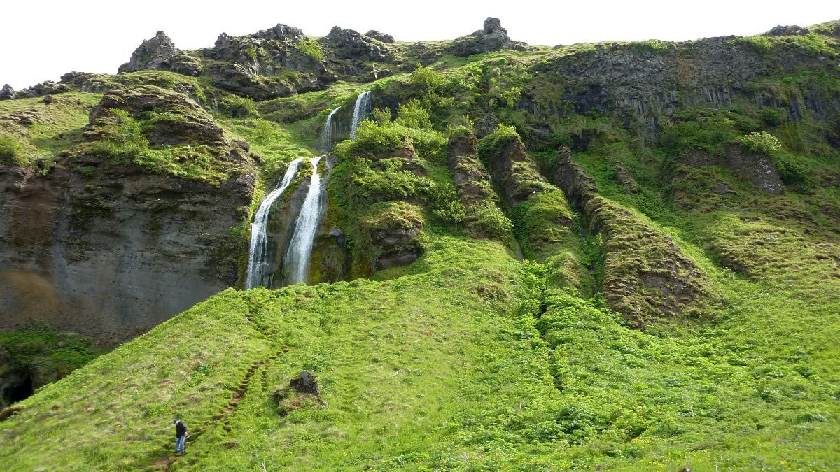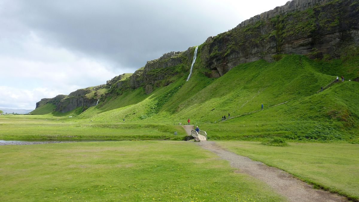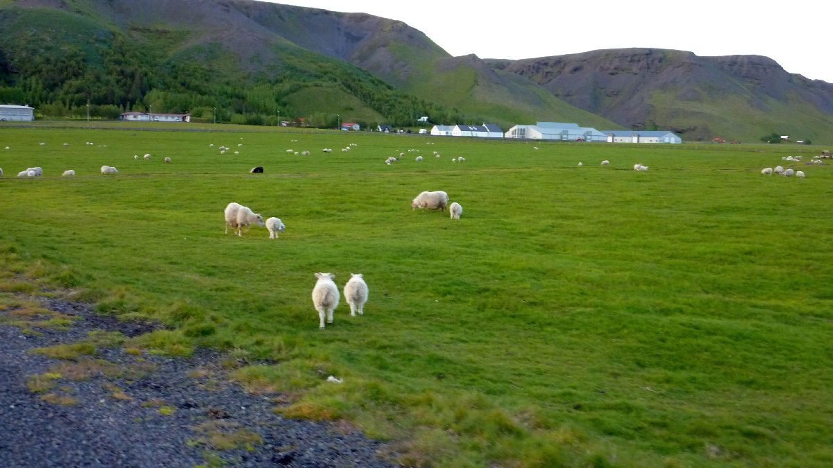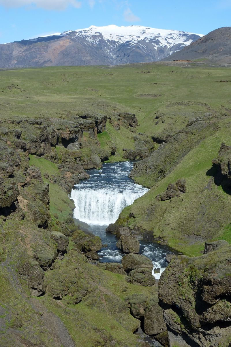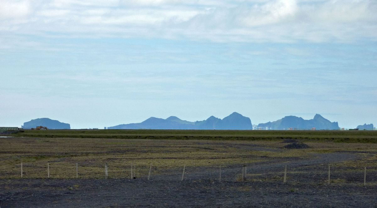 Blick über Skogar: rechts Schwemmlandflächen (Sandur), links am Hang durch Vieh entstandene "Terrassen" (Viehgangeln)