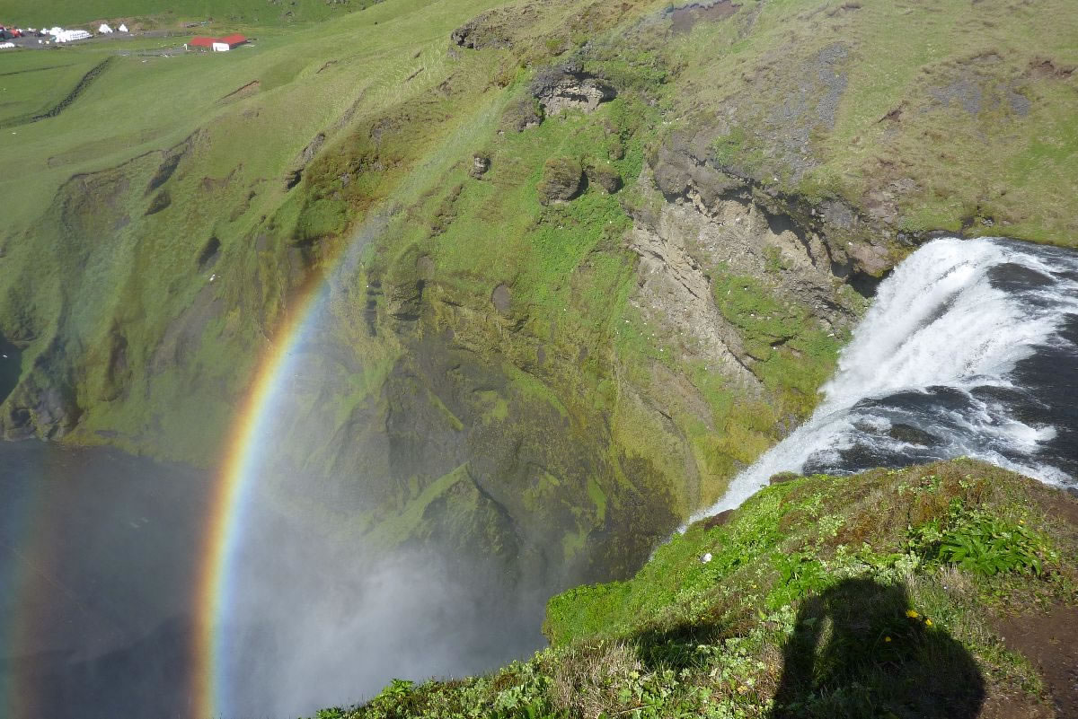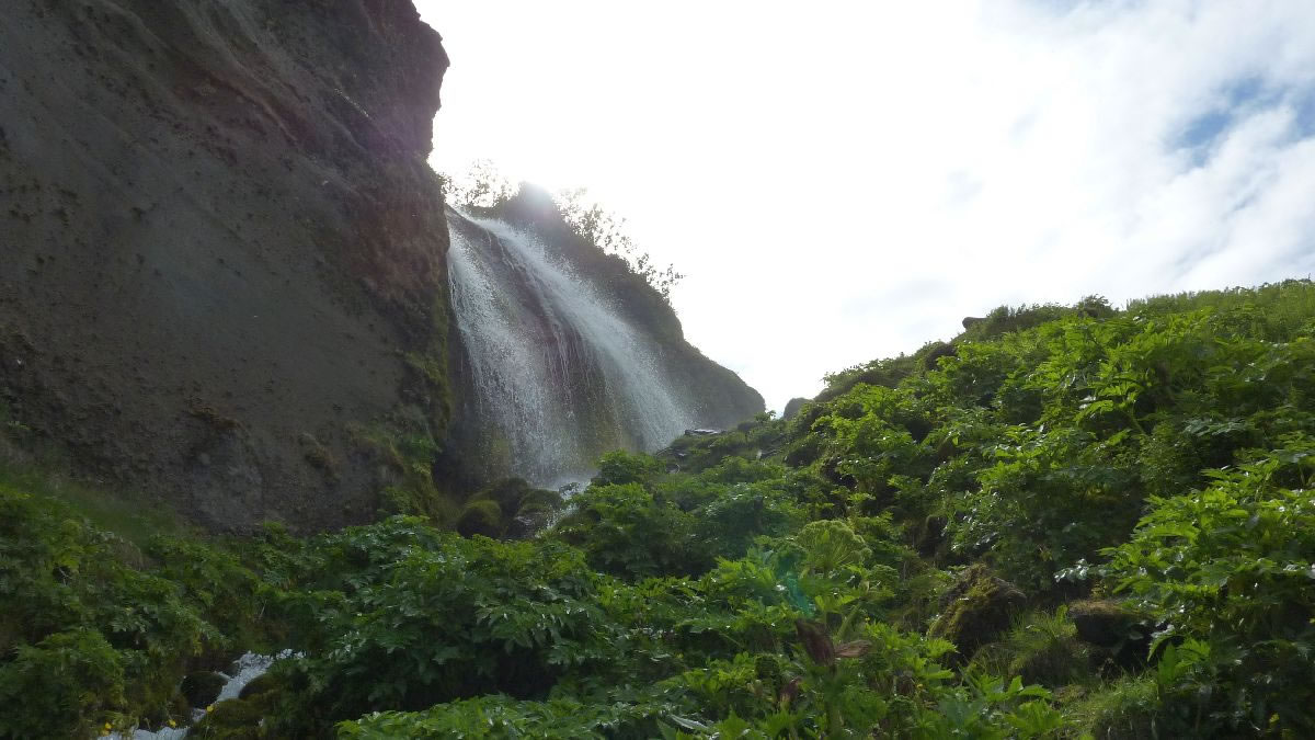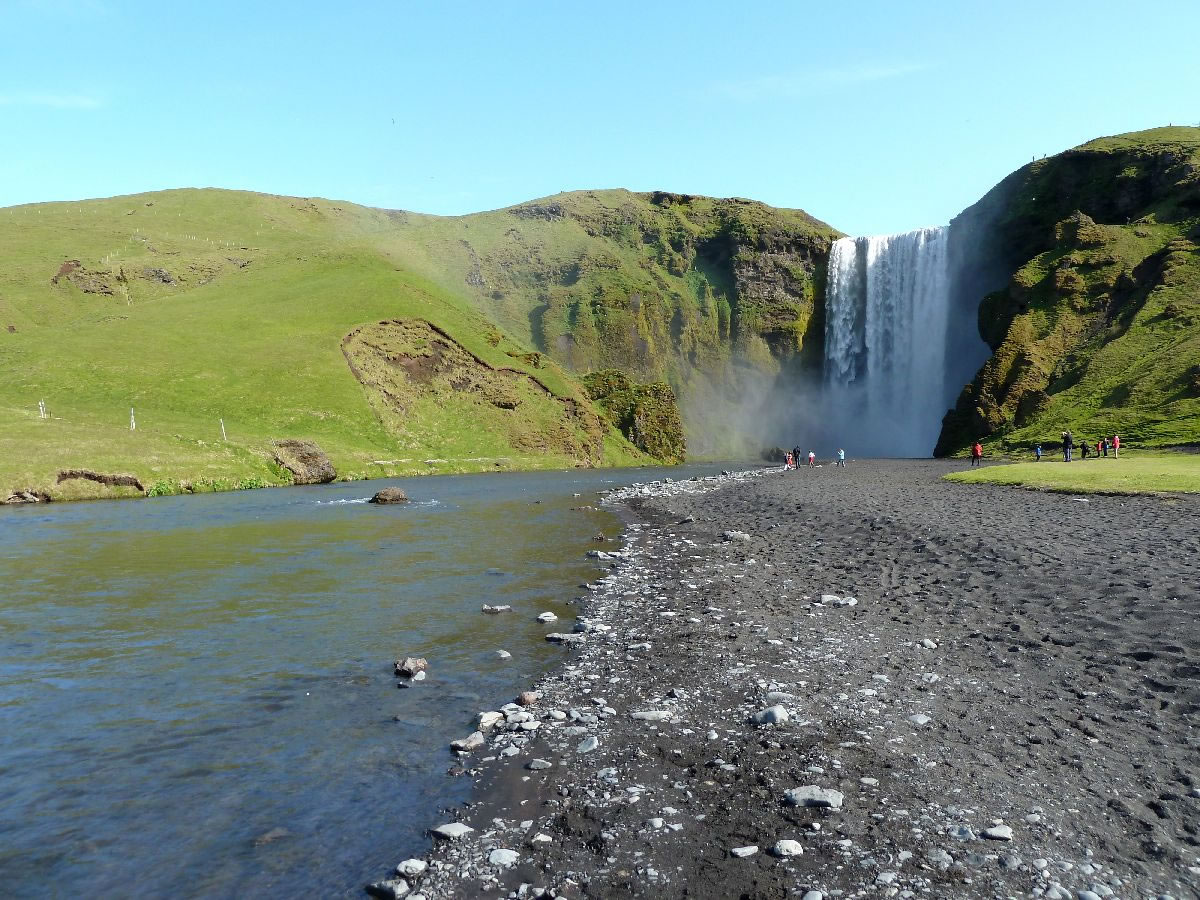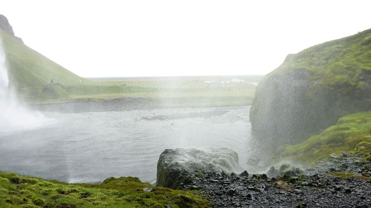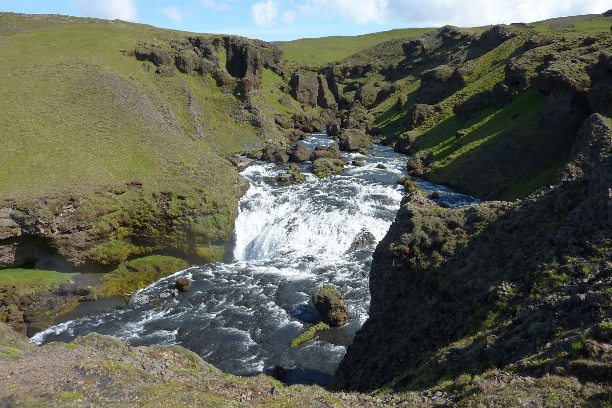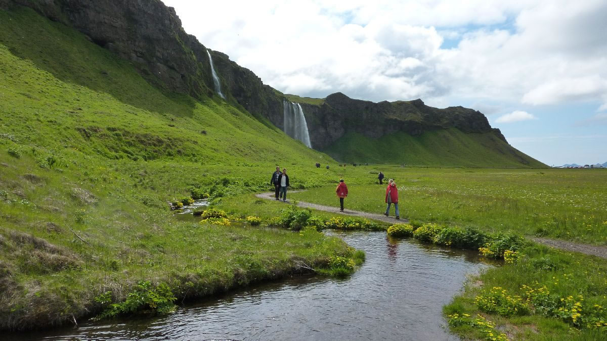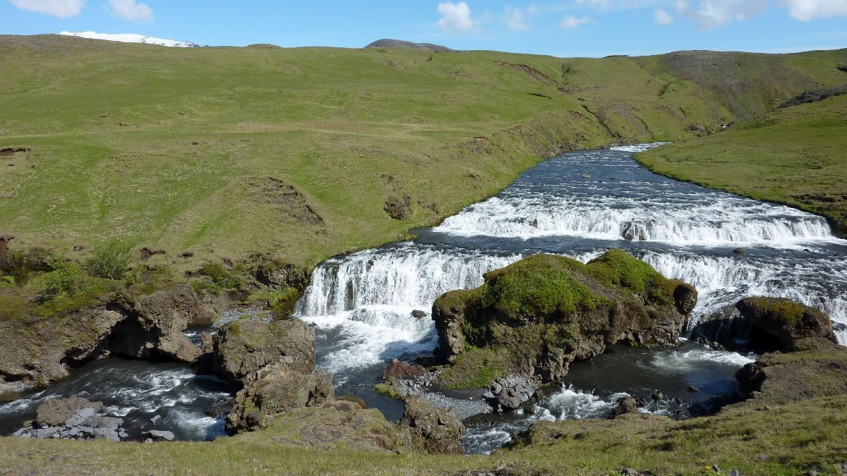 Blick über Skogar: rechts Schwemmlandflächen (Sandur), links am Hang durch Vieh entstandene "Terrassen" (Viehgangeln)