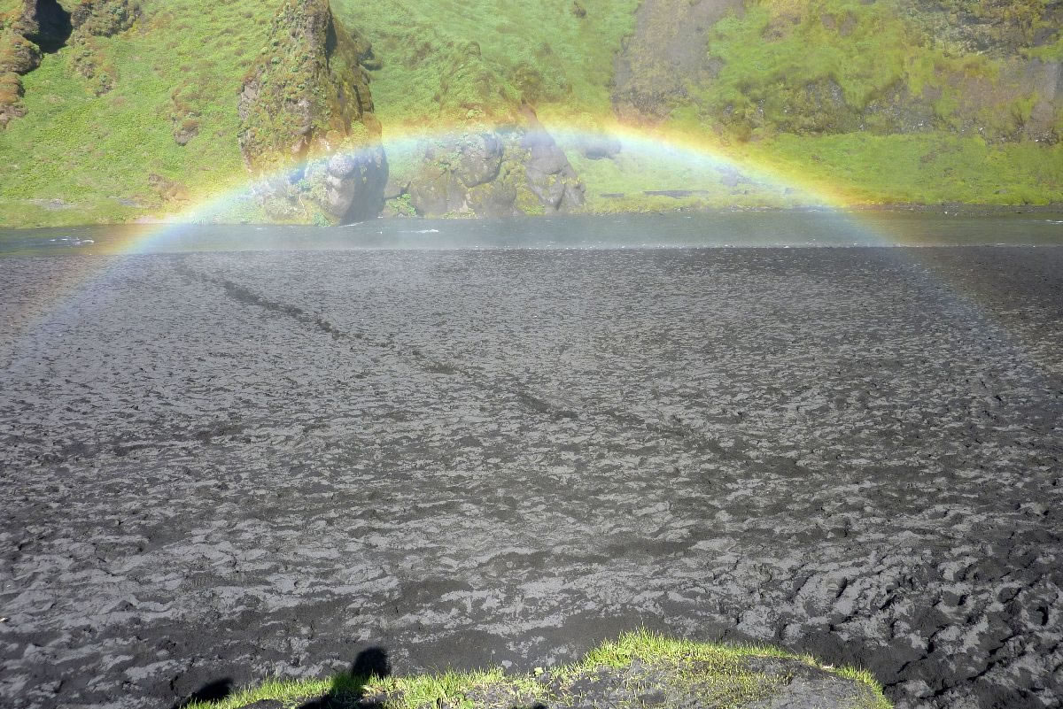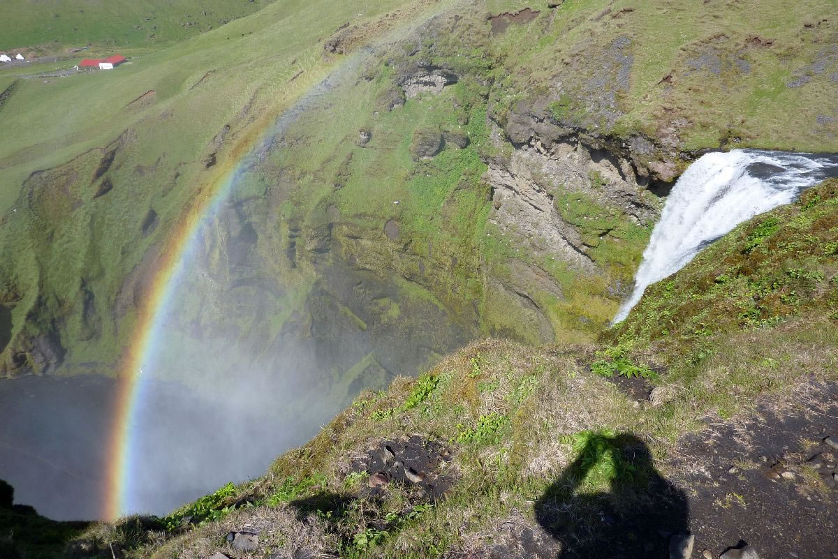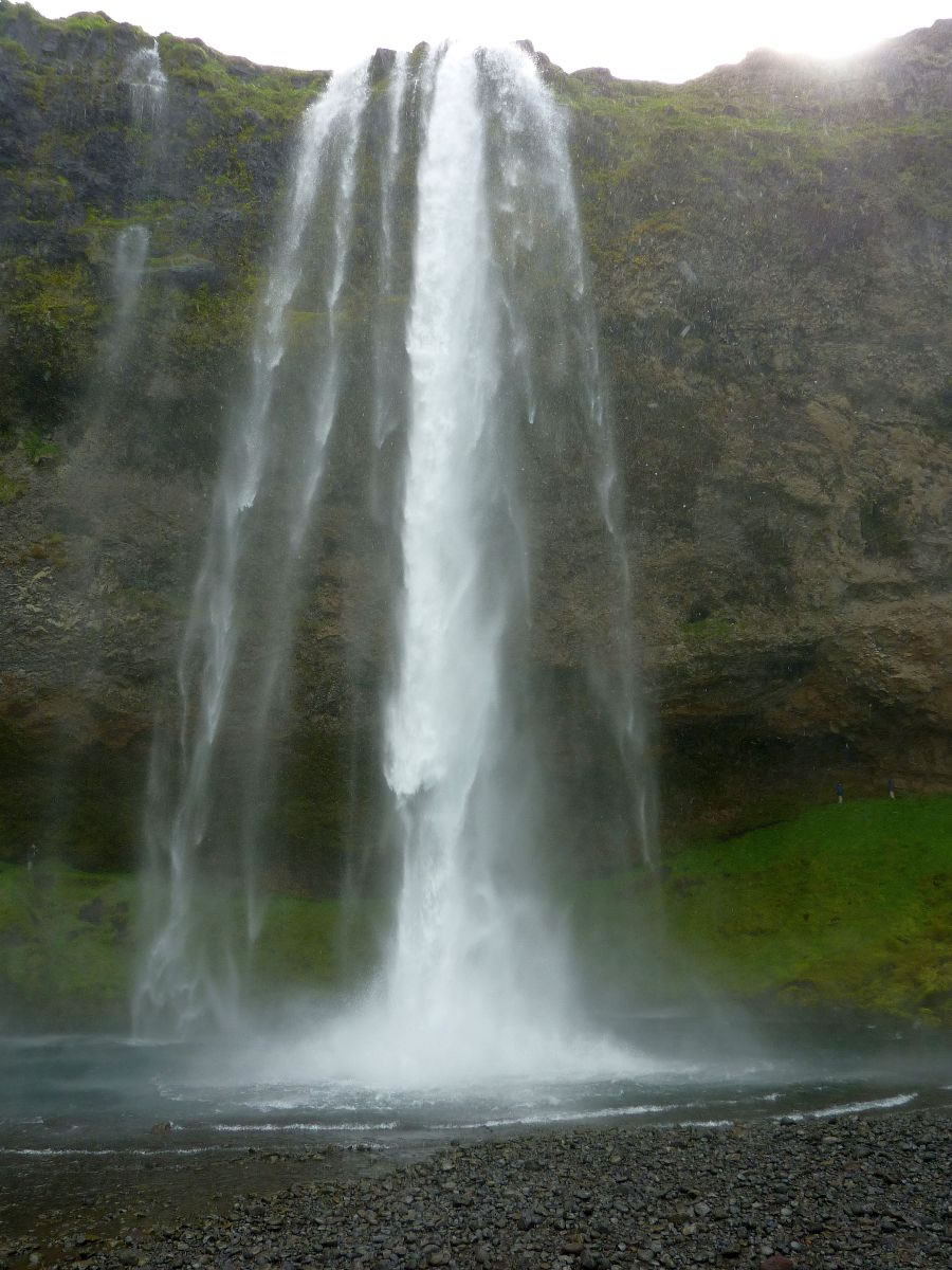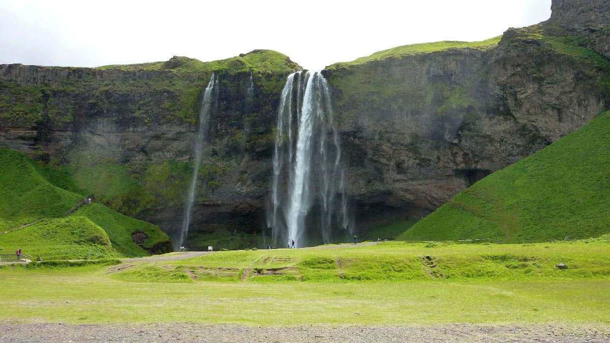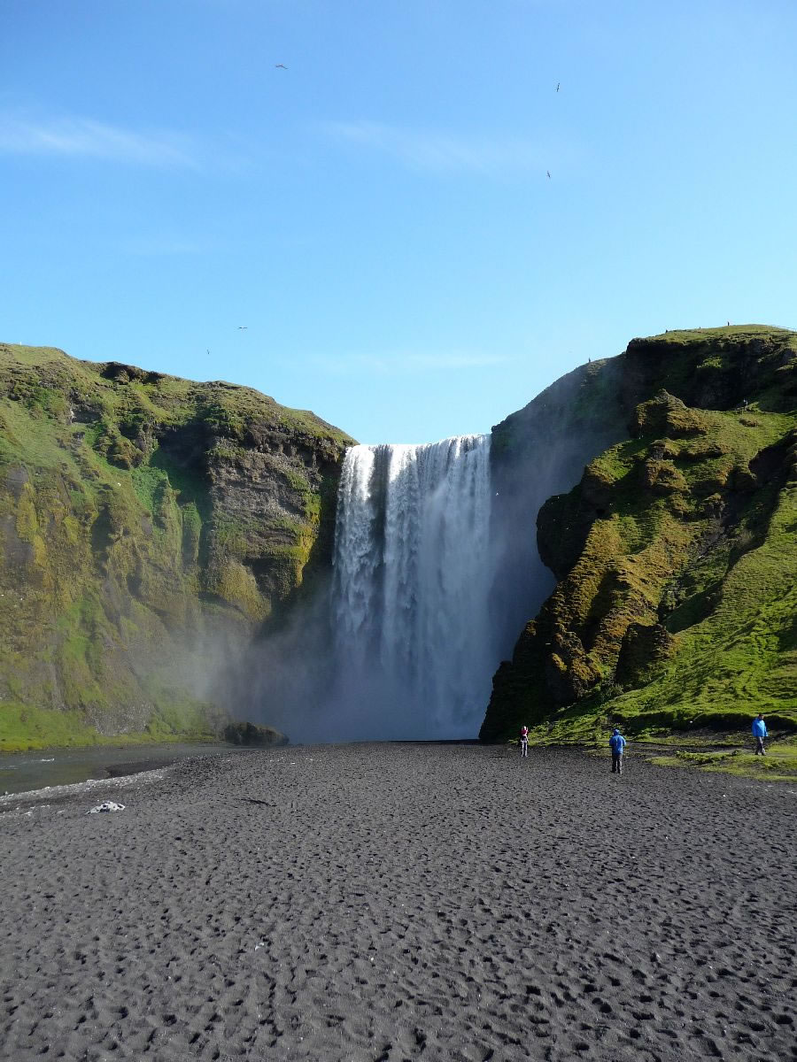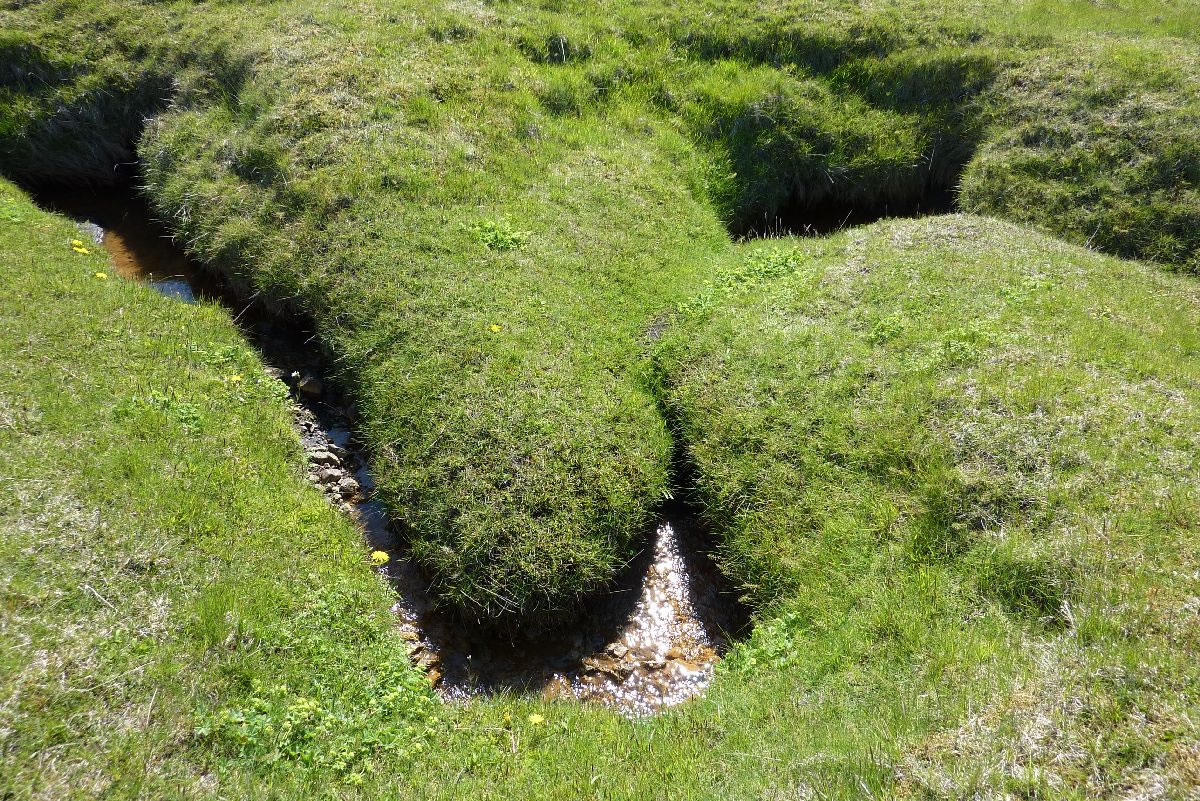 Blick über Skogar: rechts Schwemmlandflächen (Sandur), links am Hang durch Vieh entstandene "Terrassen" (Viehgangeln)