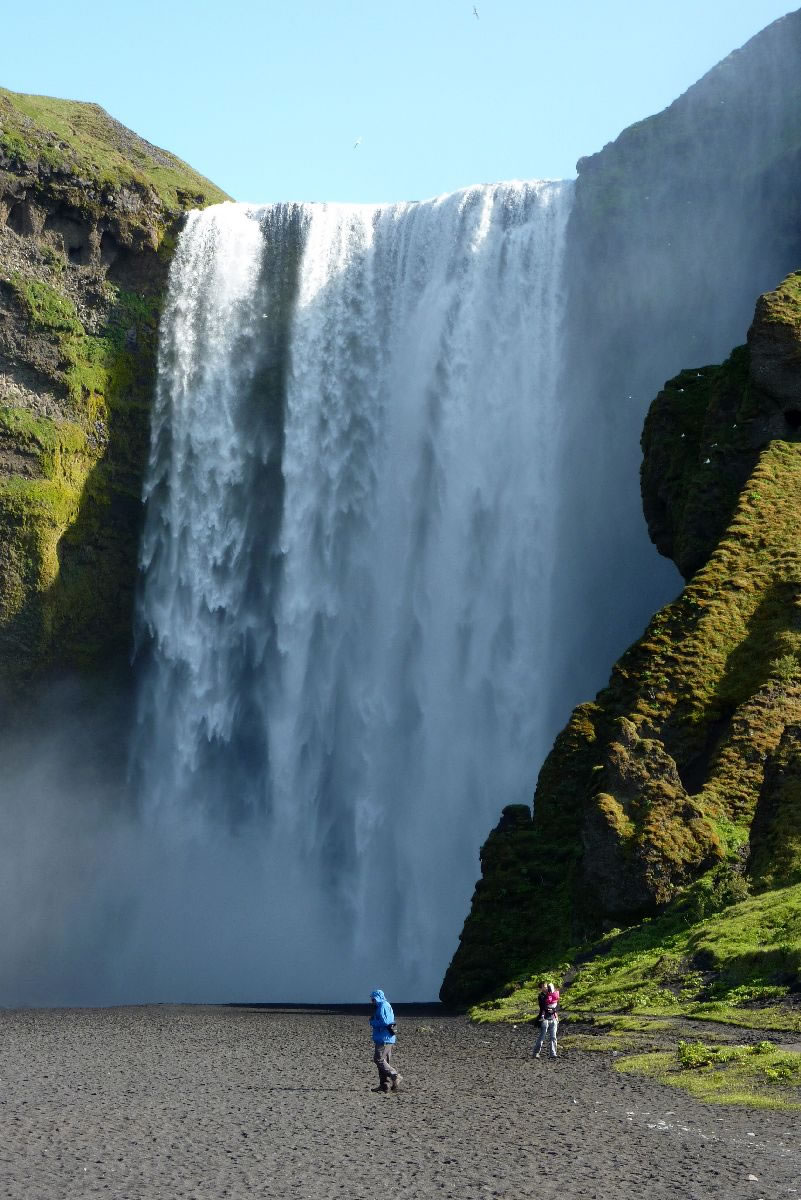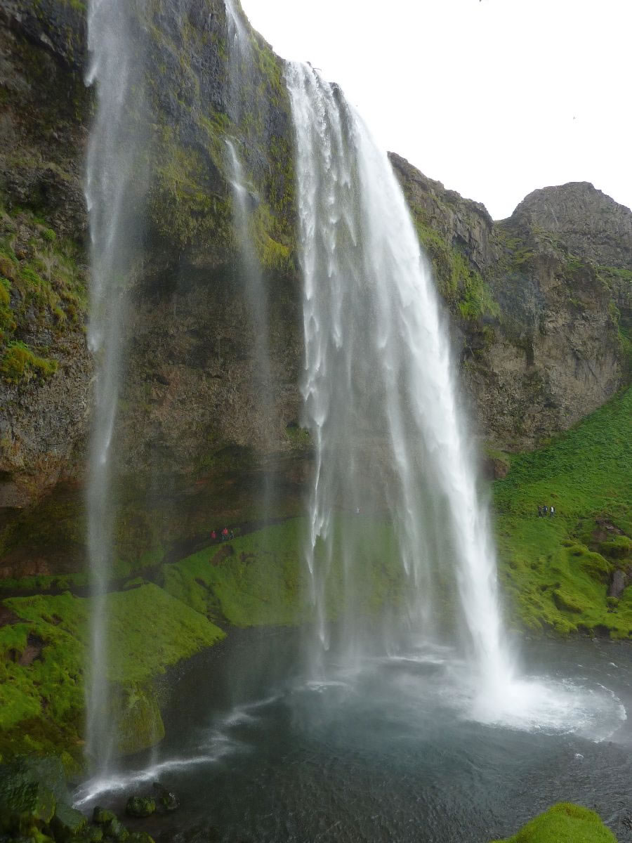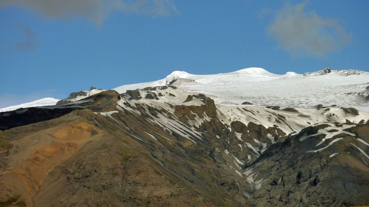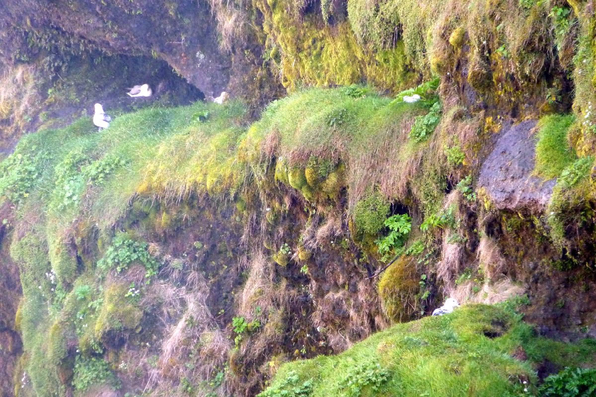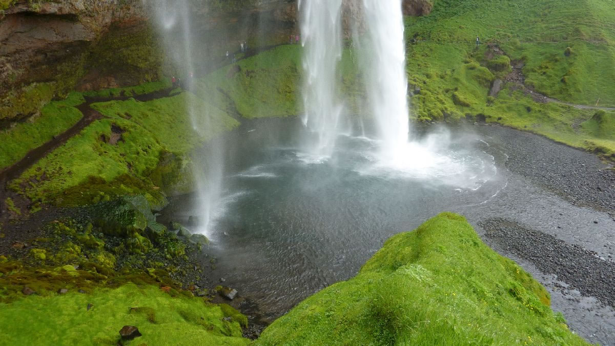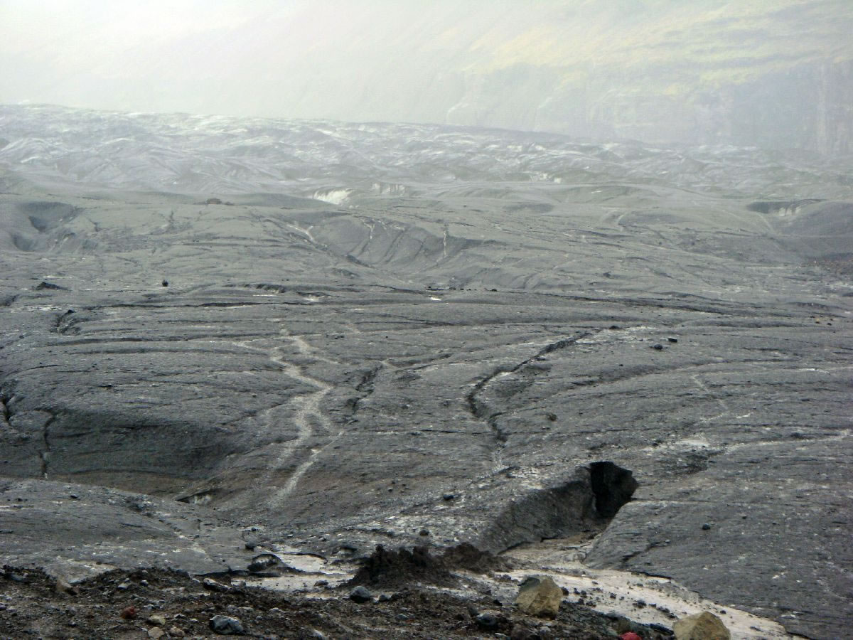 Blick über Skogar: rechts Schwemmlandflächen (Sandur), links am Hang durch Vieh entstandene "Terrassen" (Viehgangeln)