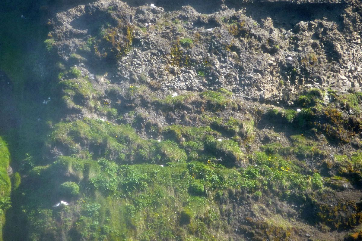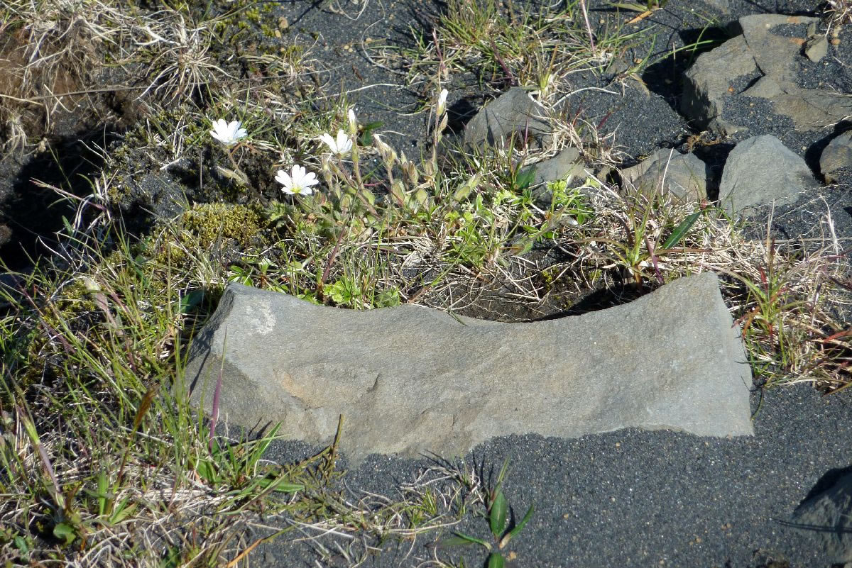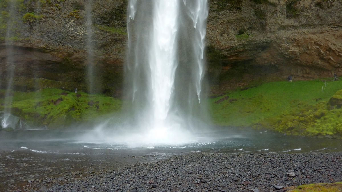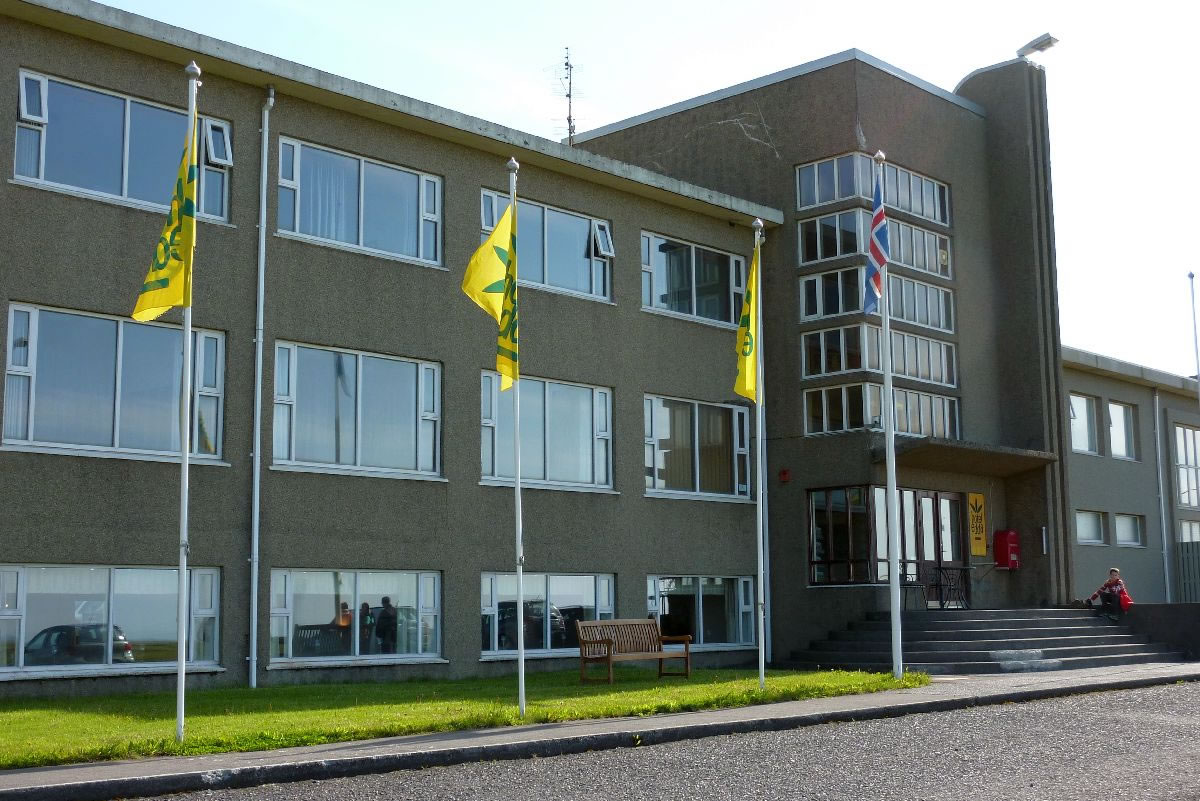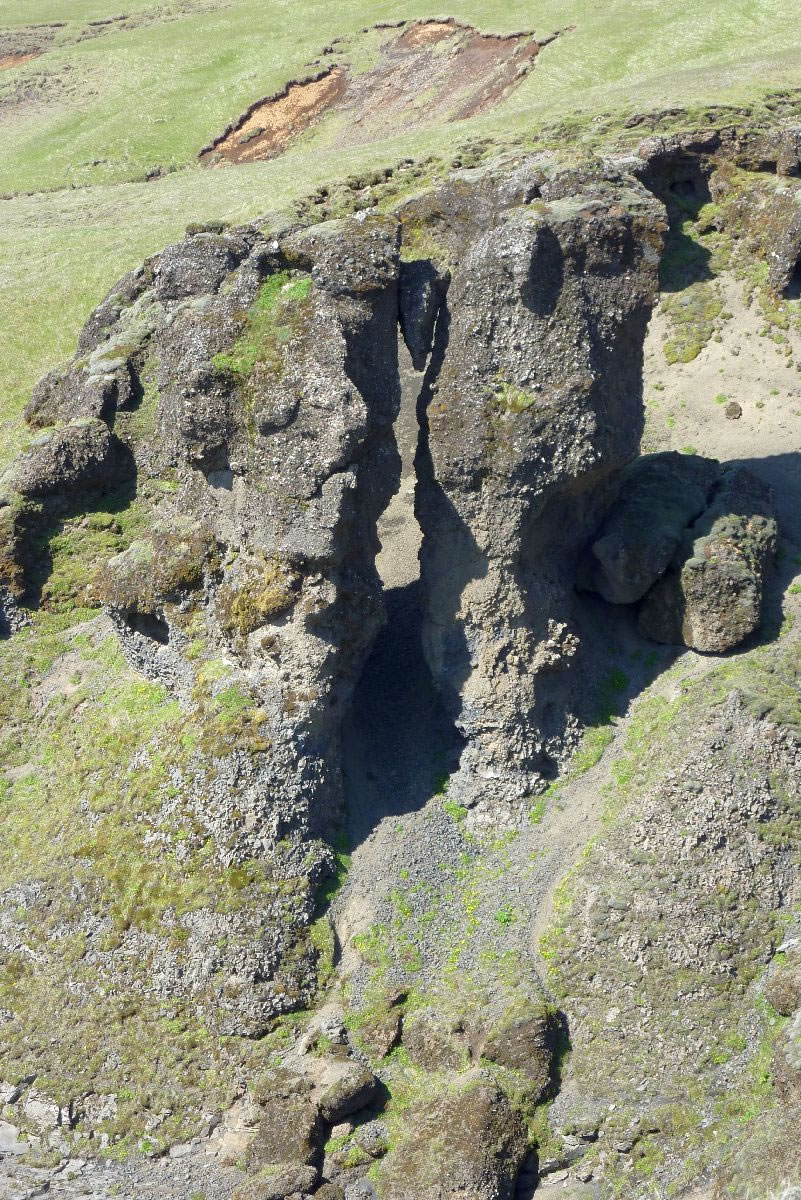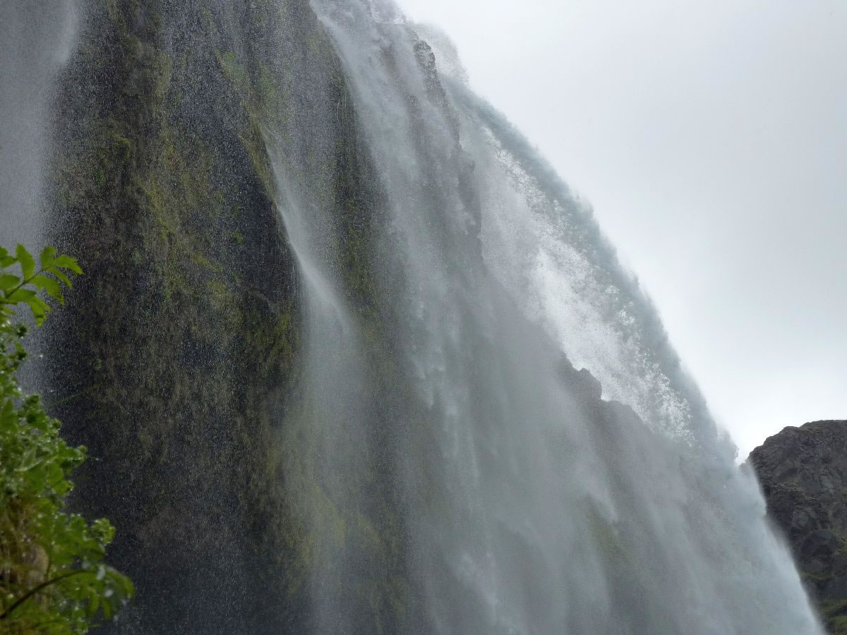 Blick über Skogar: rechts Schwemmlandflächen (Sandur), links am Hang durch Vieh entstandene "Terrassen" (Viehgangeln)