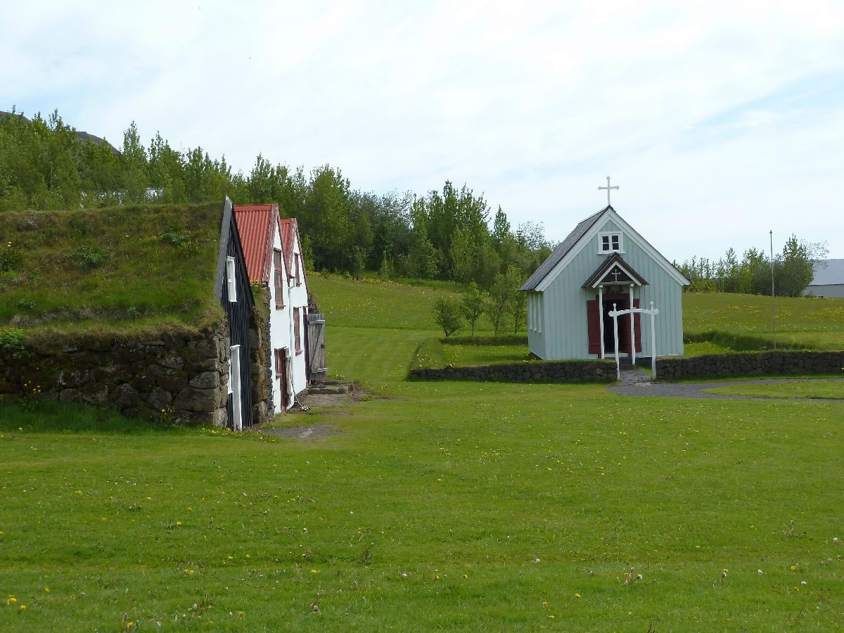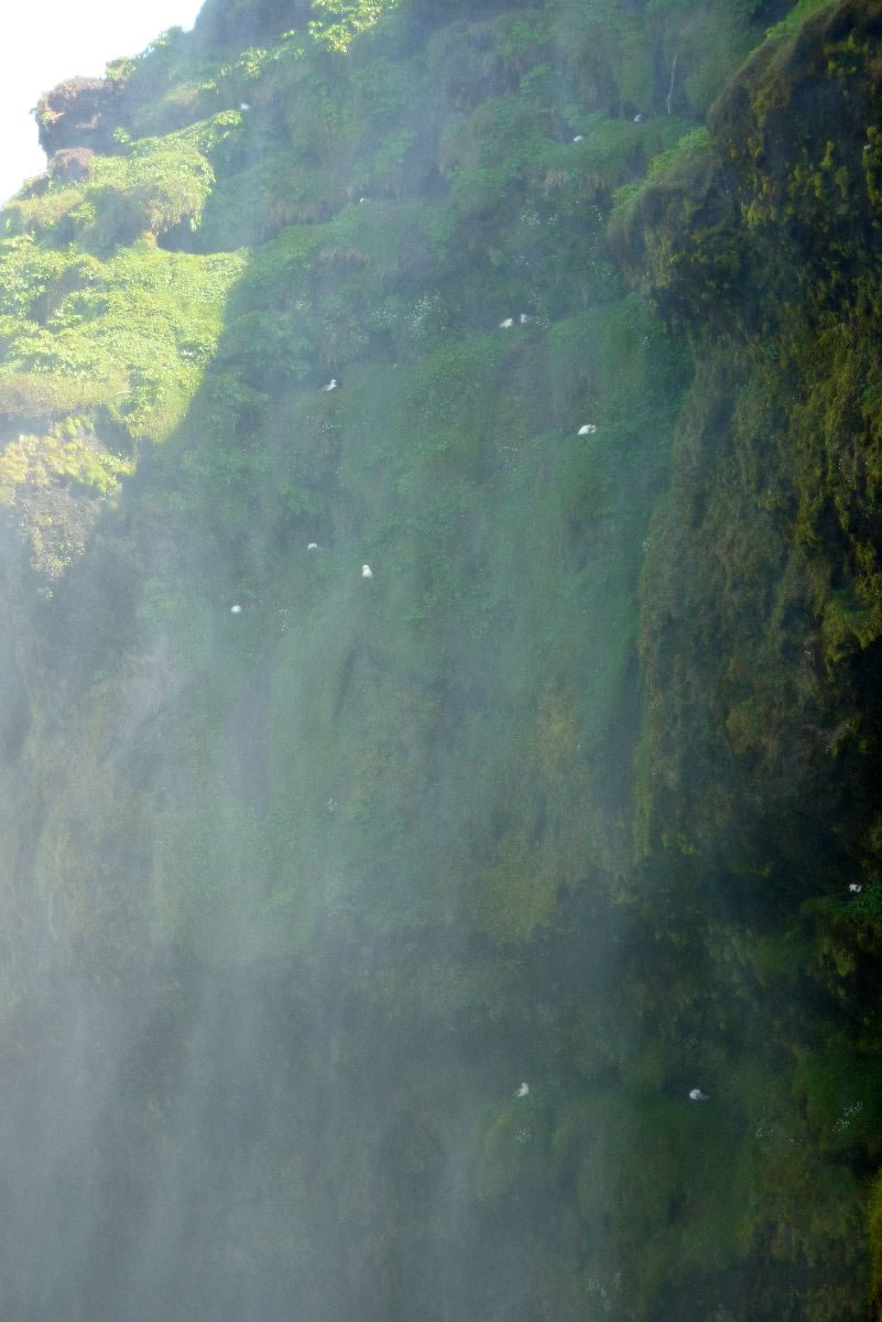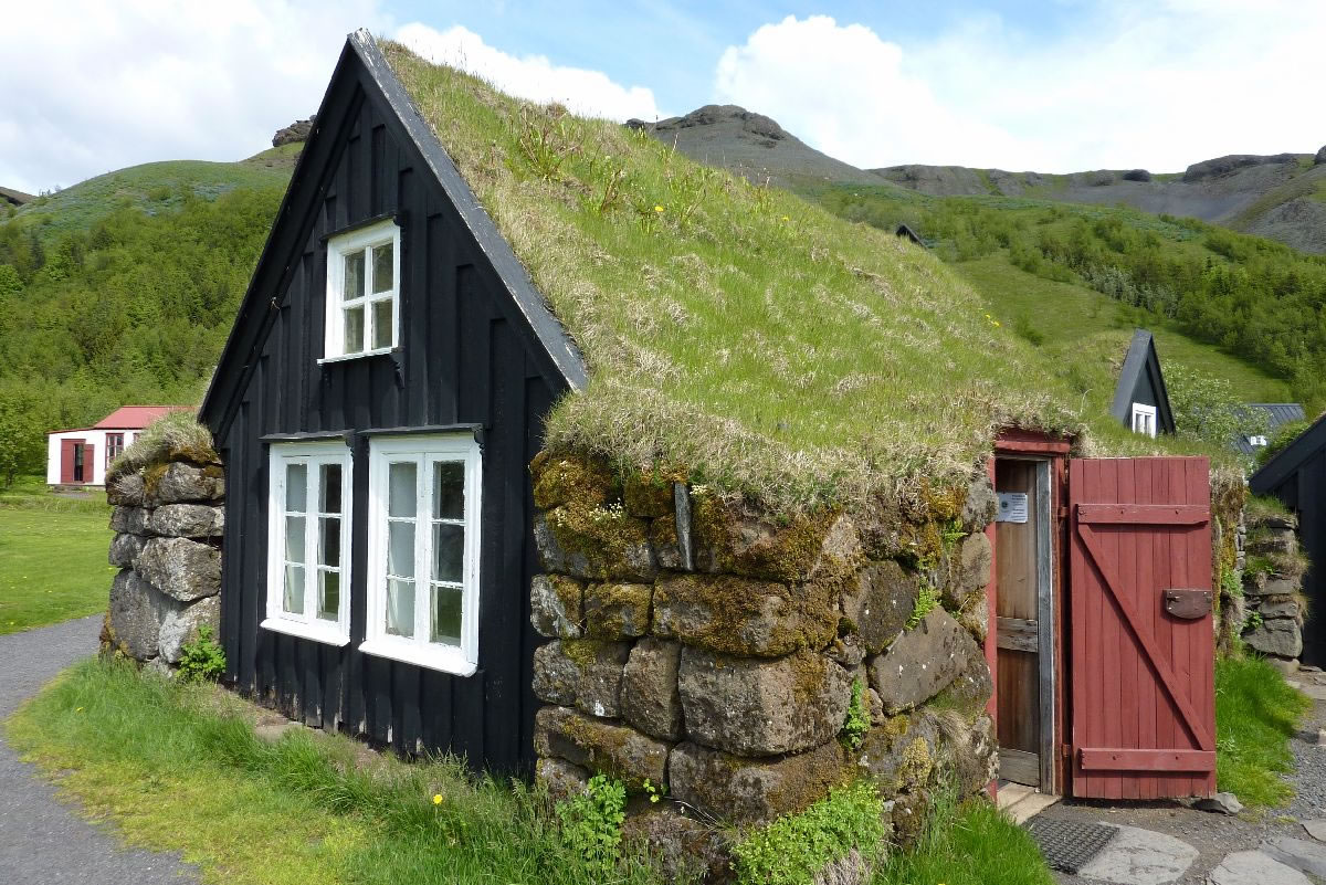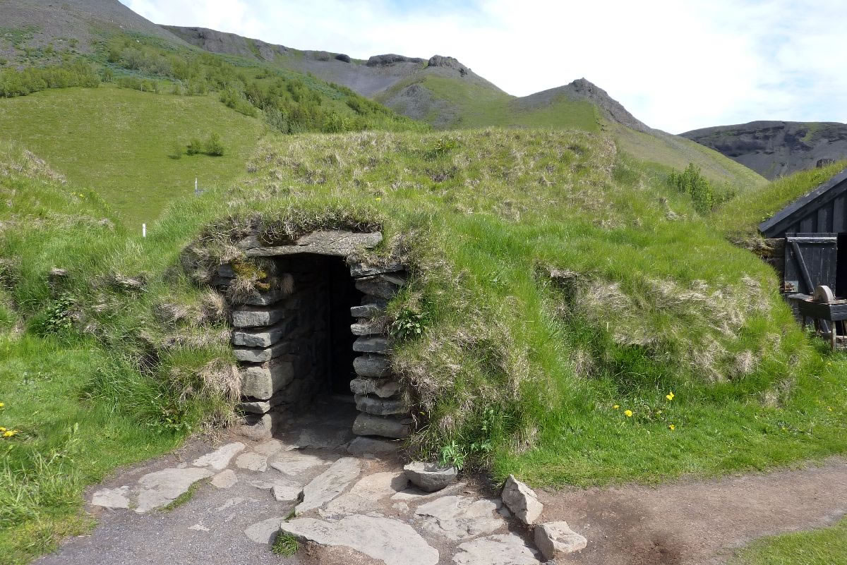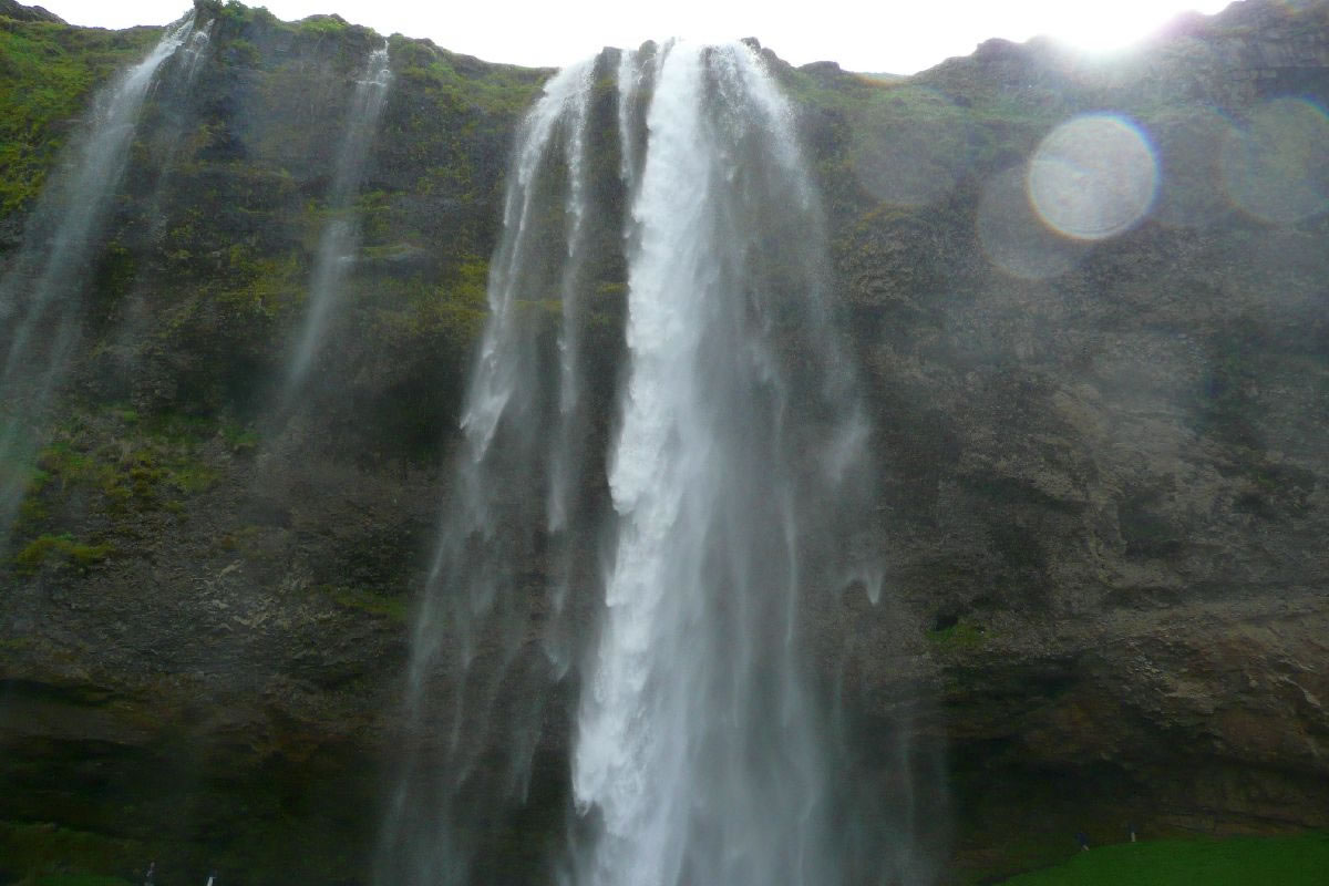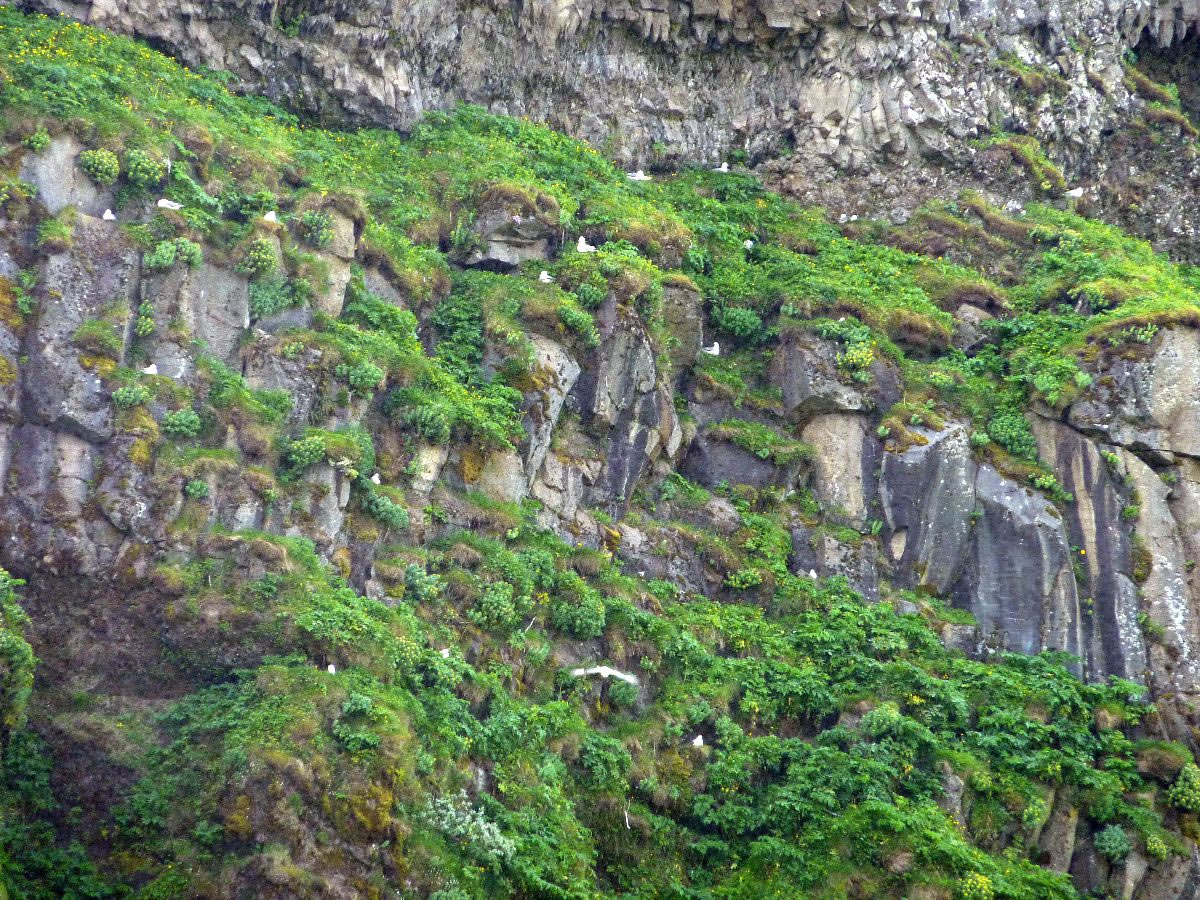 Blick über Skogar: rechts Schwemmlandflächen (Sandur), links am Hang durch Vieh entstandene "Terrassen" (Viehgangeln)