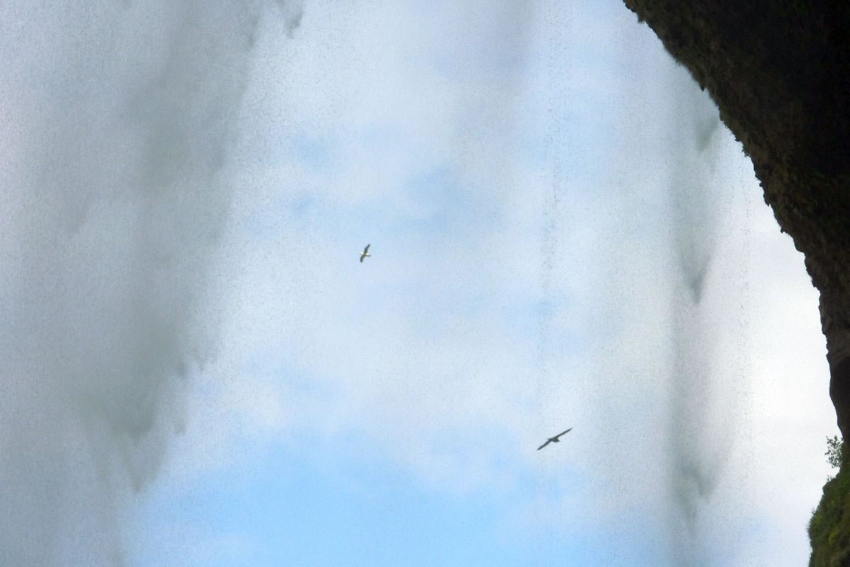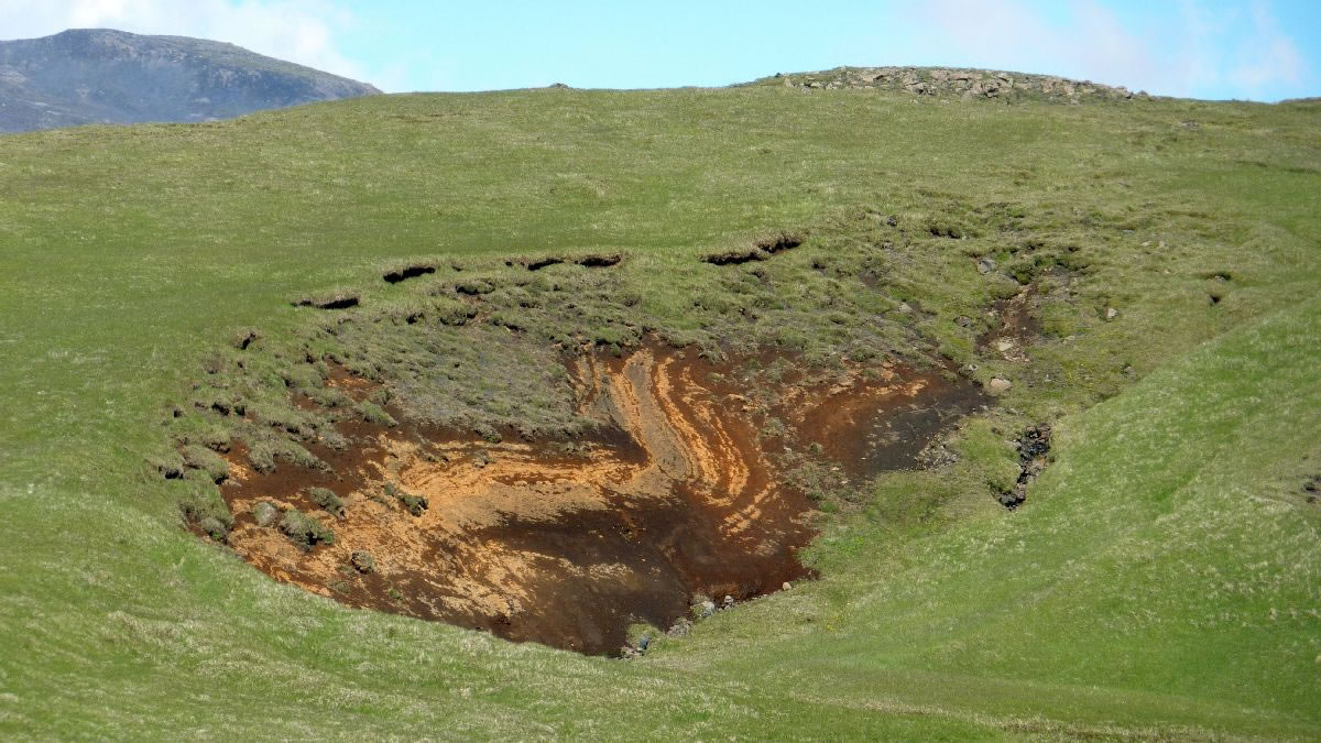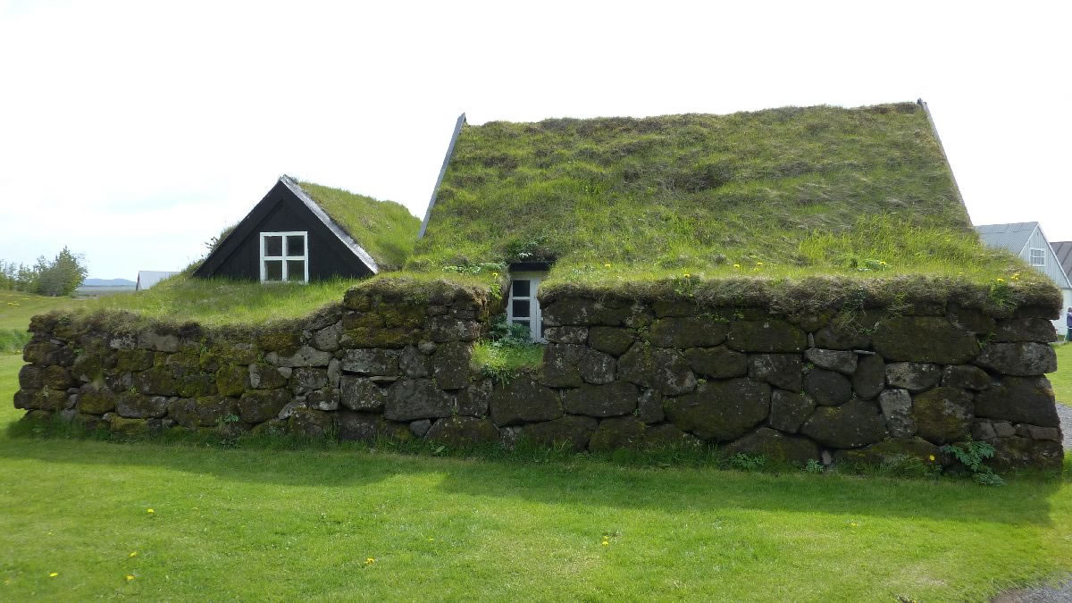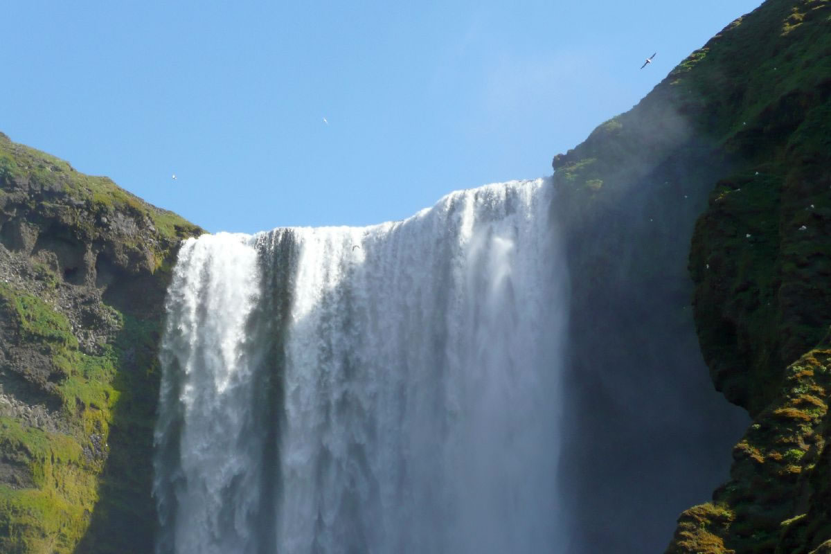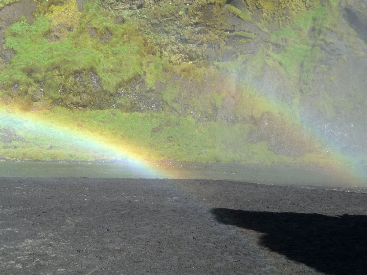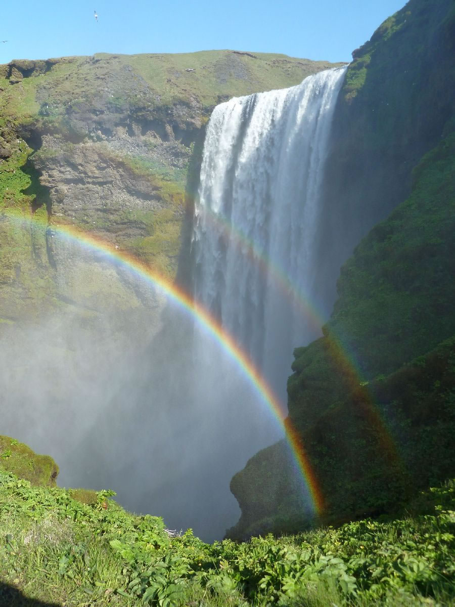 Blick über Skogar: rechts Schwemmlandflächen (Sandur), links am Hang durch Vieh entstandene "Terrassen" (Viehgangeln)